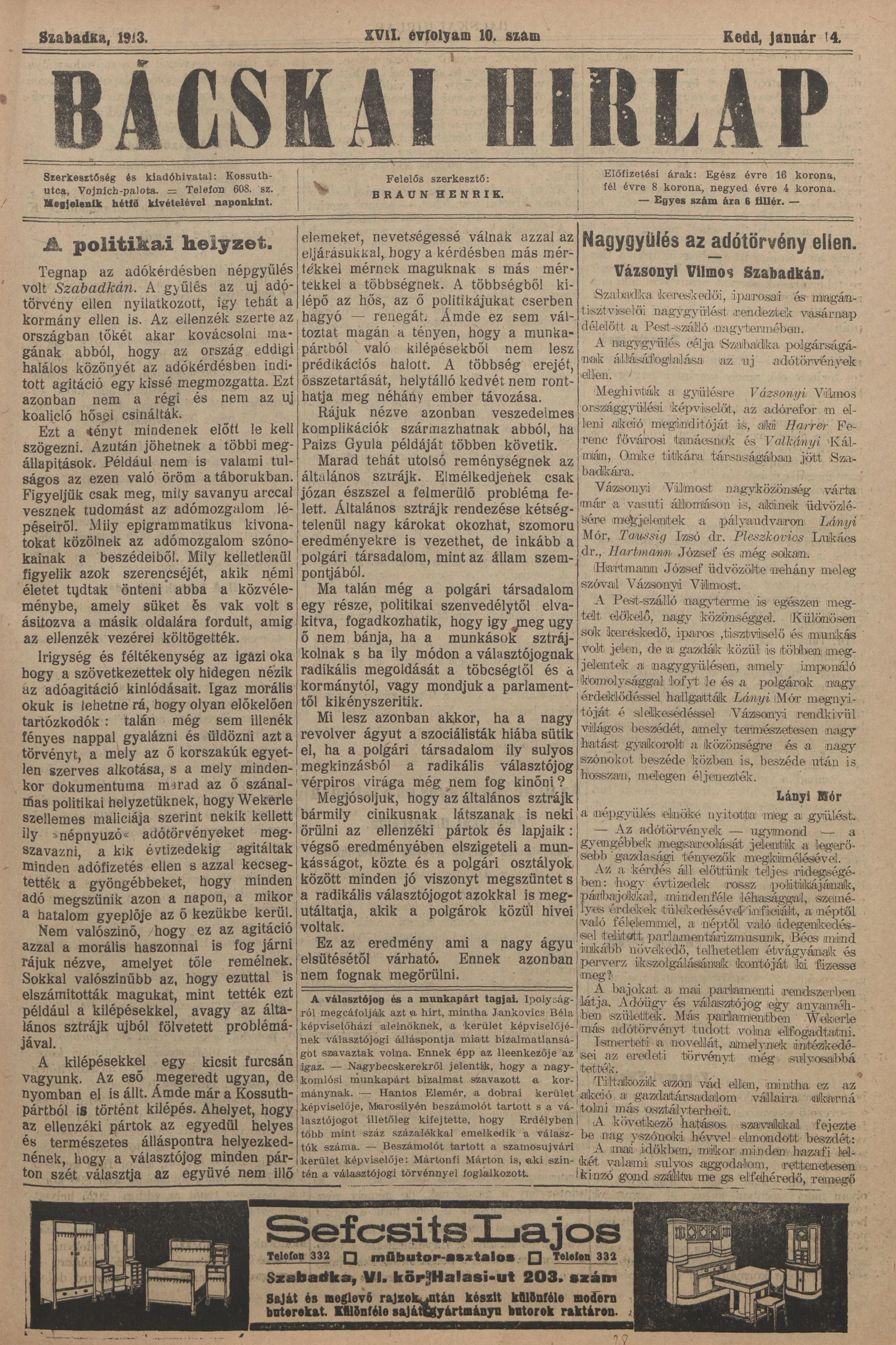 Bácskai Hirlap, 17. évf. 1913. január 14. 10. sz.
