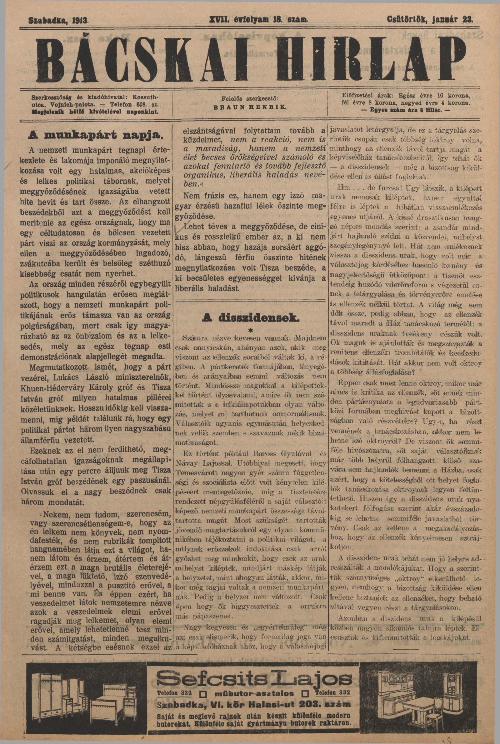 Bácskai Hirlap, 17. évf. 1913. január 23. 18. sz.