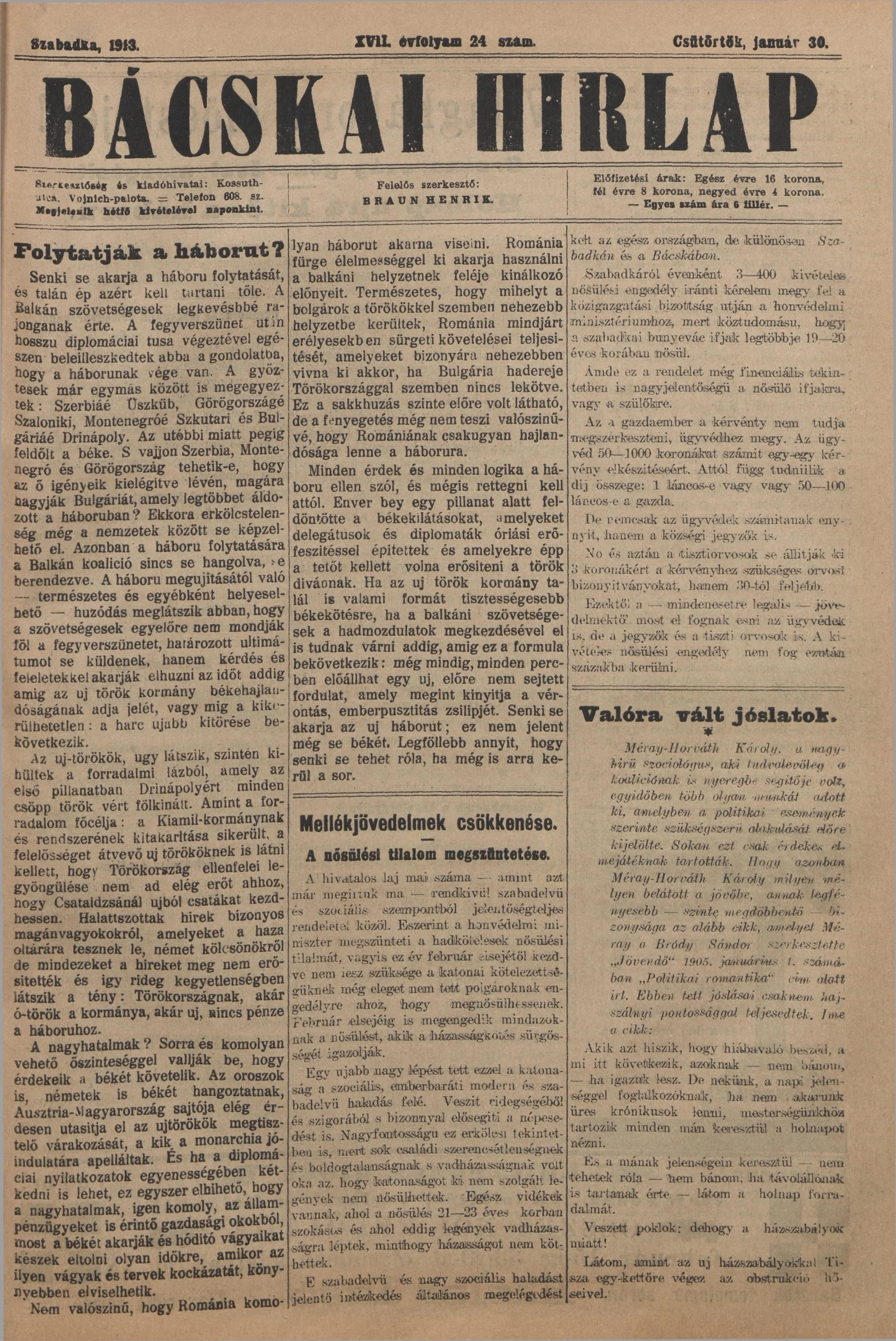 Bácskai Hirlap, 17. évf. 1913. január 30. 24. sz.