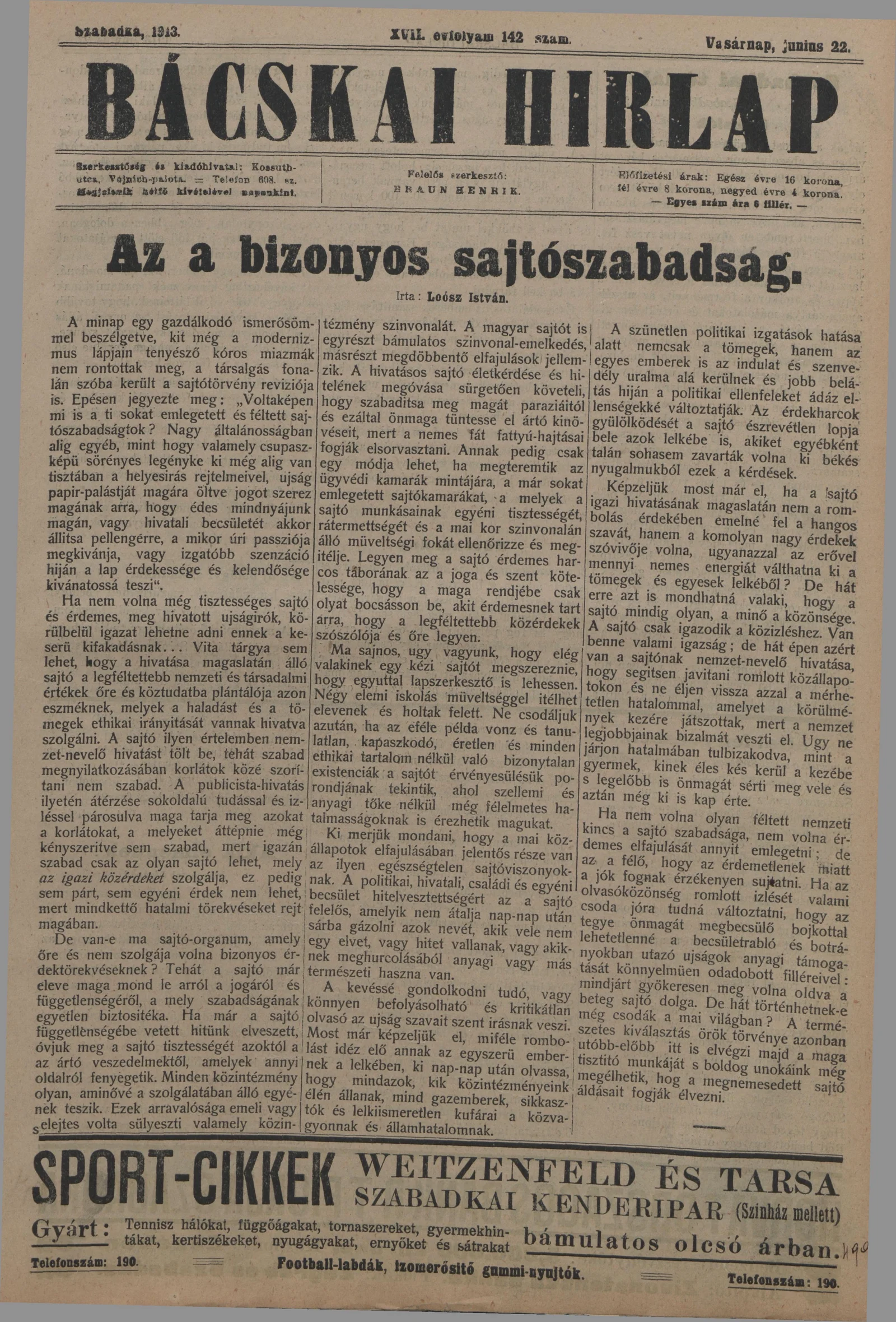 Bácskai Hirlap, 17. évf. 1913. június 22. 142. sz.