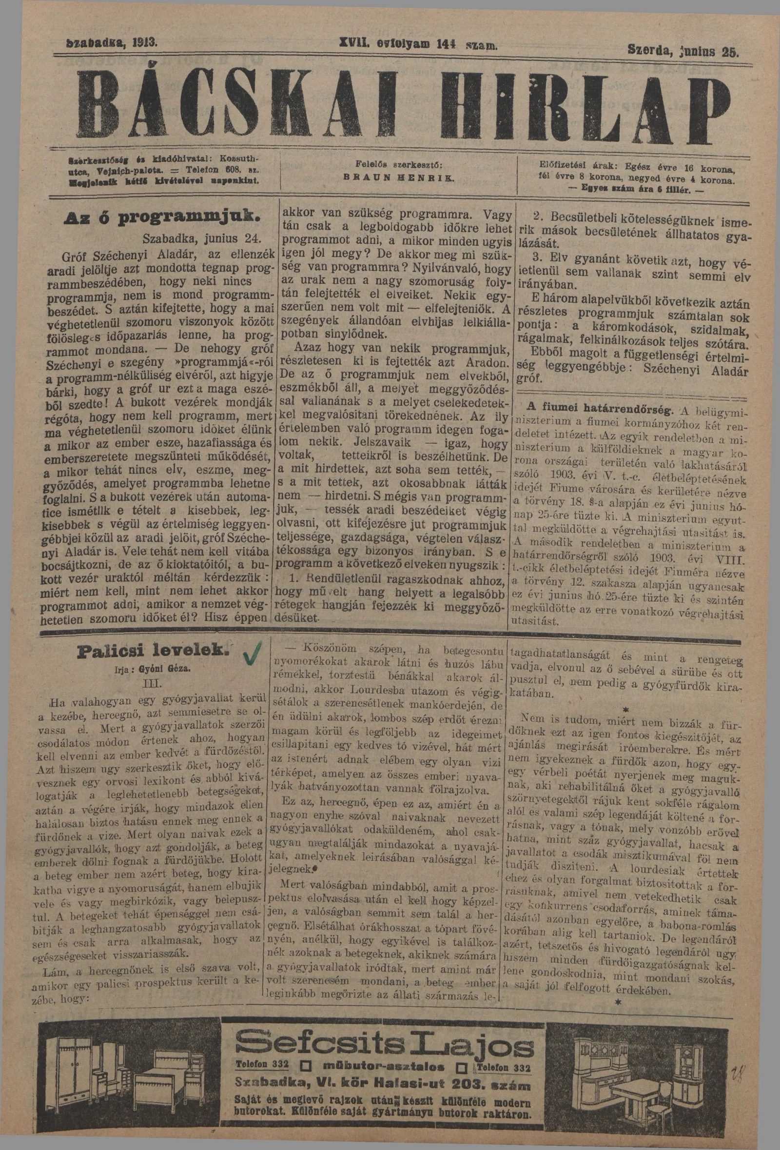 Bácskai Hirlap, 17. évf. 1913. június 25. 144. sz.