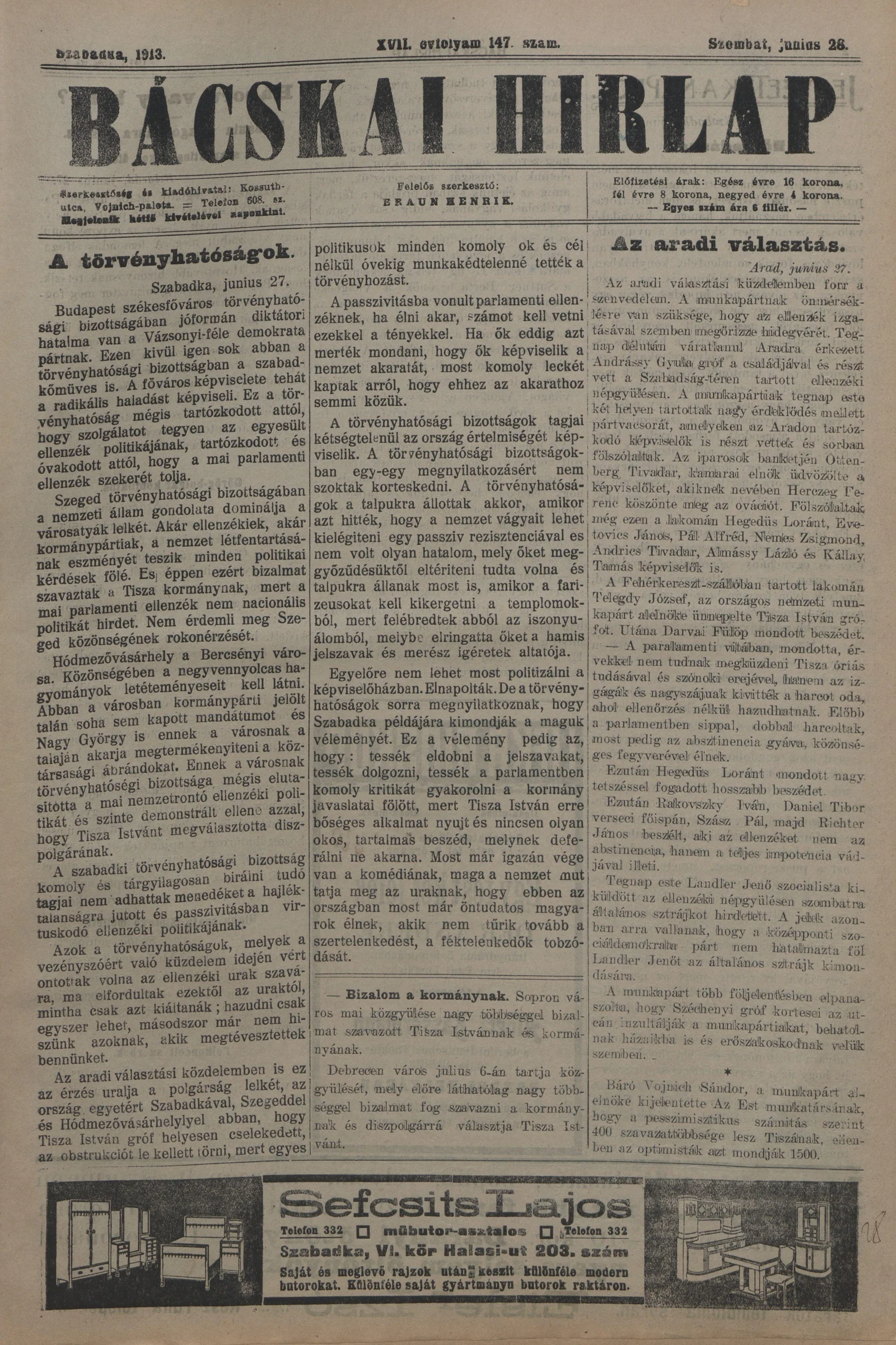Bácskai Hirlap, 17. évf. 1913. június 28. 147. sz.