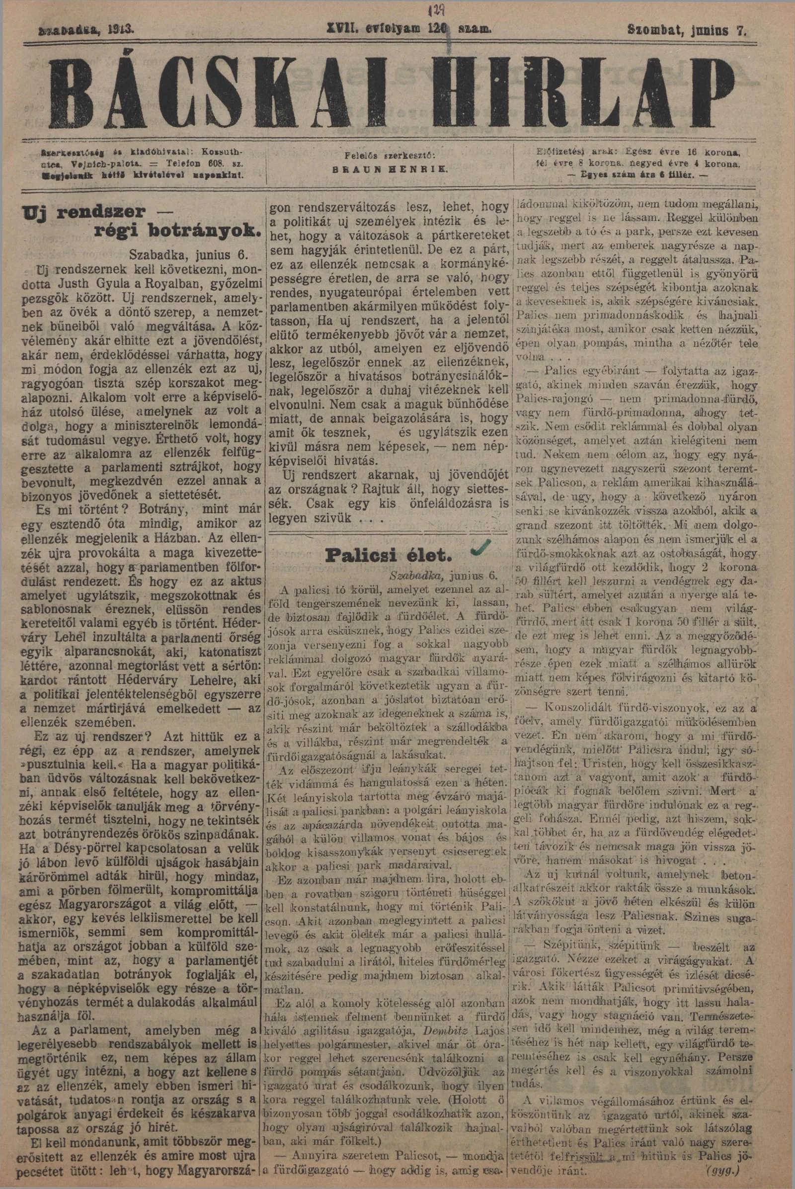 Bácskai Hirlap, 17. évf. 1913. június 7. 129. sz.