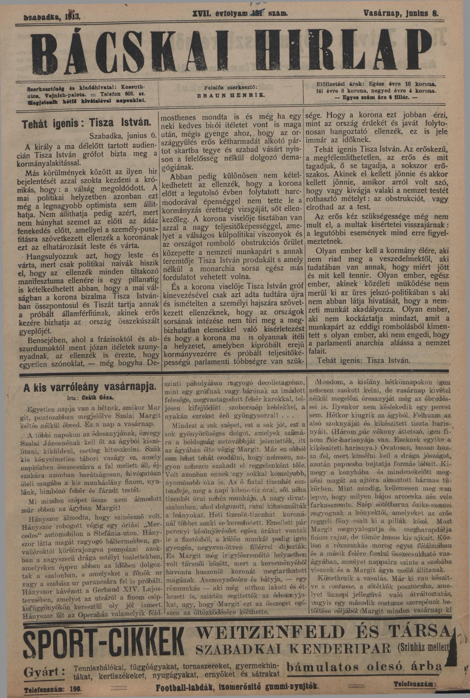 Bácskai Hirlap, 17. évf. 1913. június 8. 130. sz.