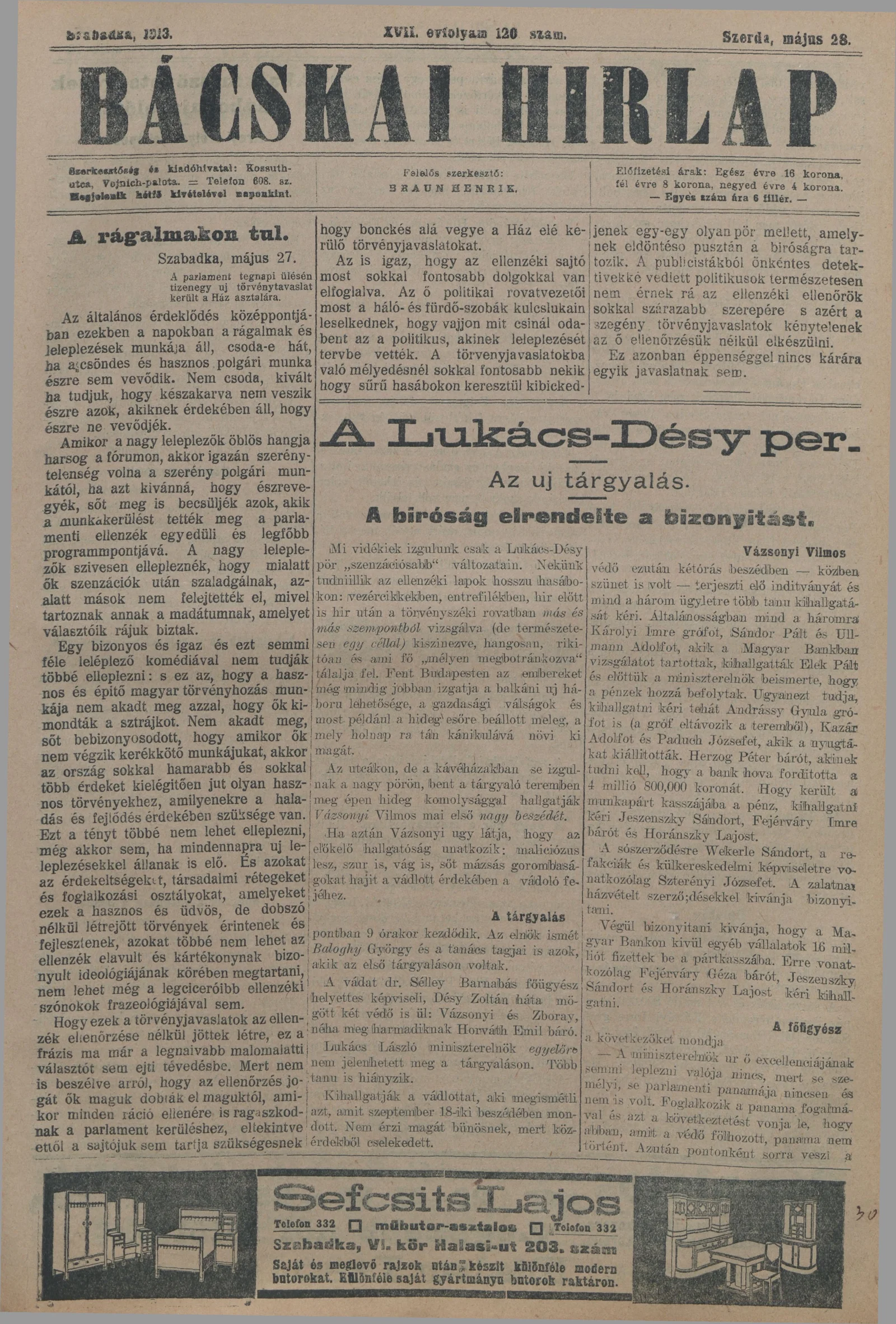 Bácskai Hirlap, 17. évf. 1913. május 28. 120. sz.
