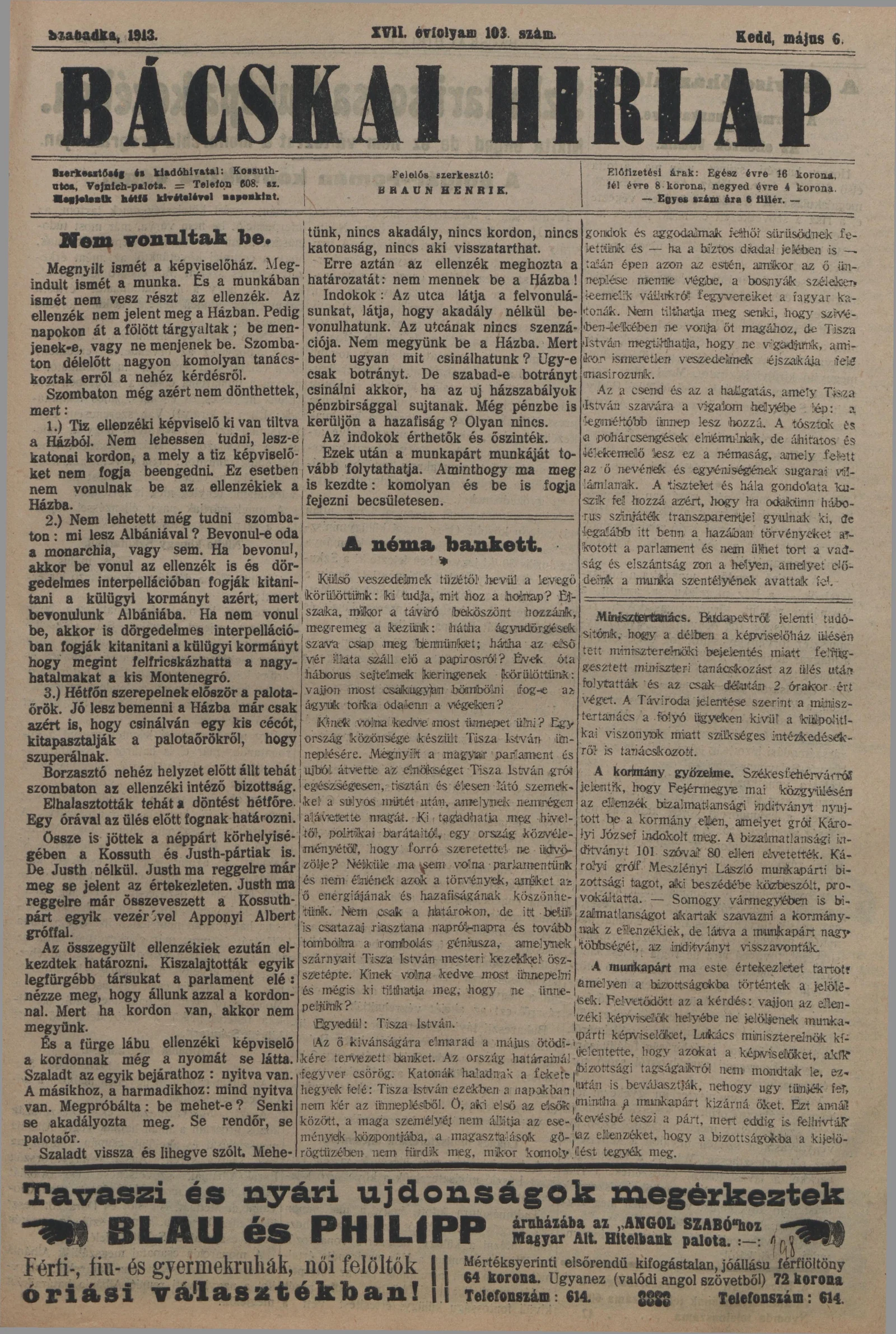 Bácskai Hirlap, 17. évf. 1913. május 6. 103. sz.