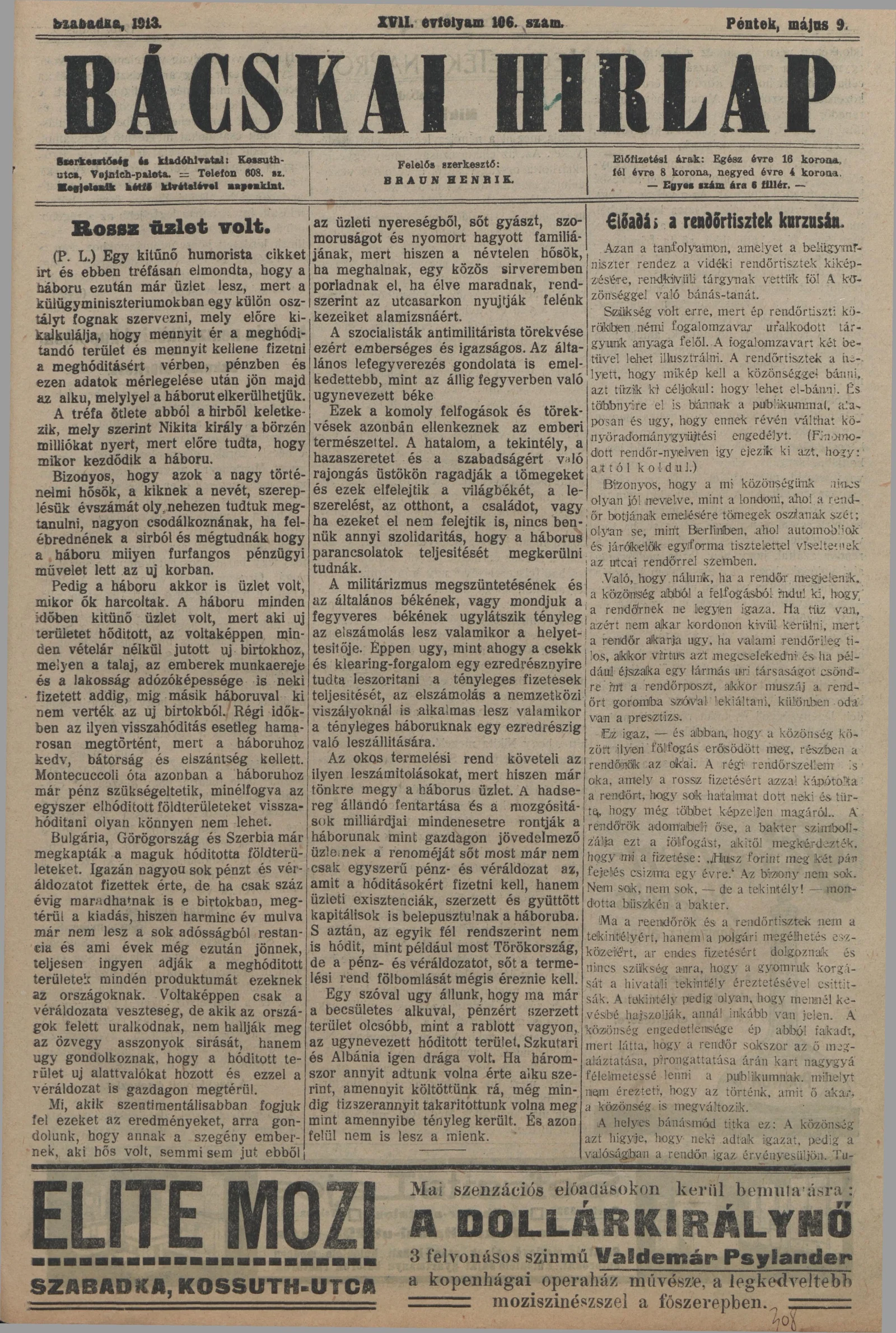 Bácskai Hirlap, 17. évf. 1913. május 9. 106. sz.