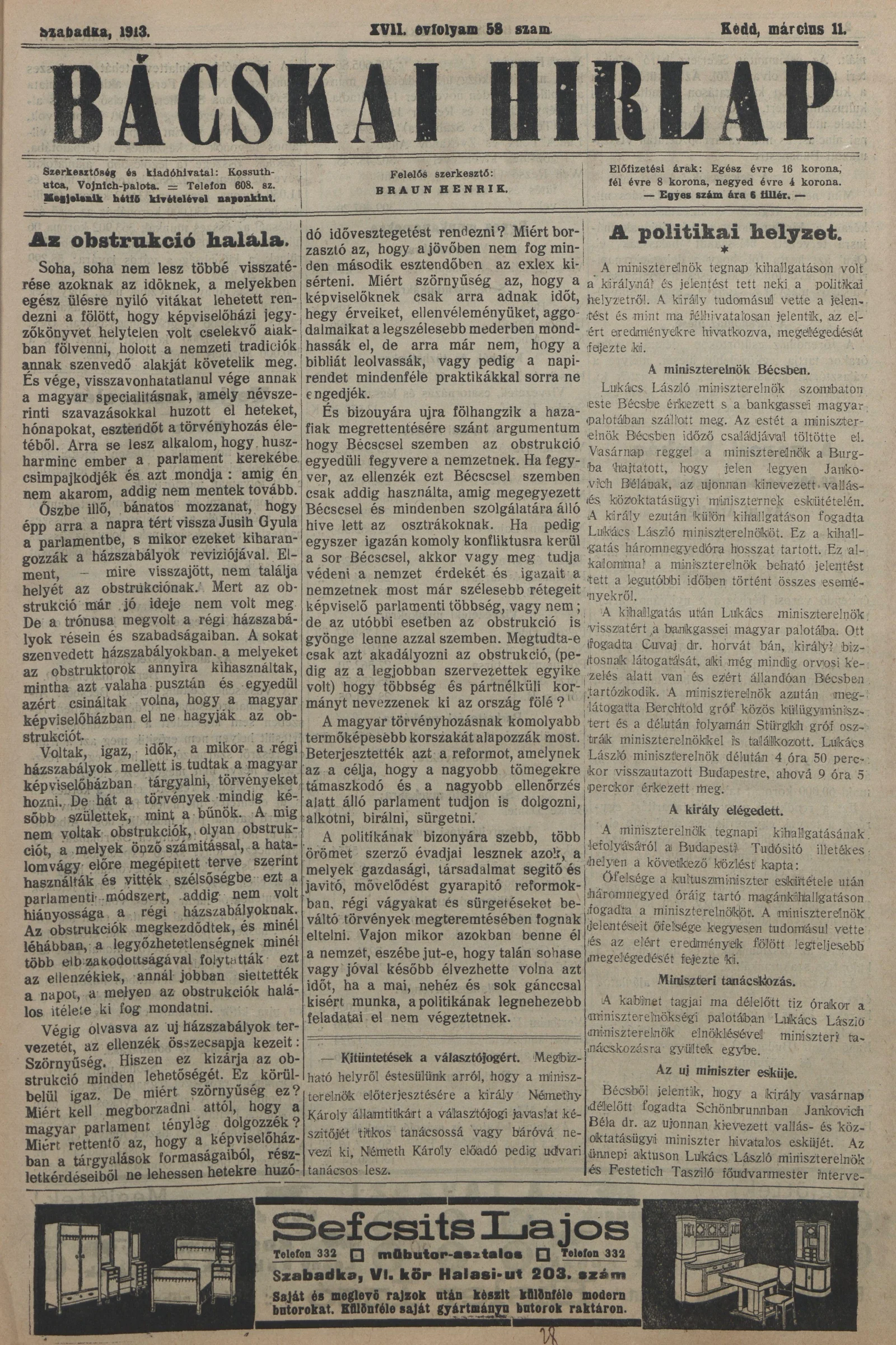 Bácskai Hirlap, 17. évf. 1913. március 11. 58. sz.