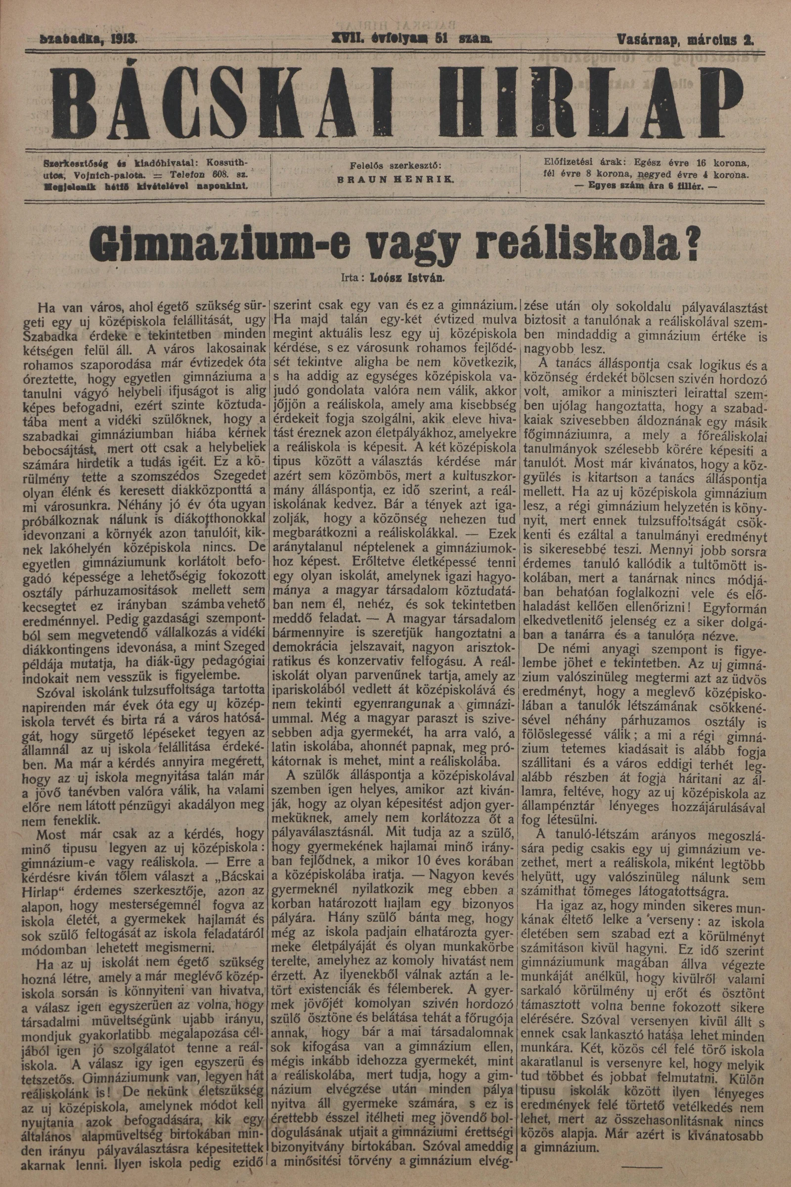 Bácskai Hirlap, 17. évf. 1913. március 2. 51. sz.