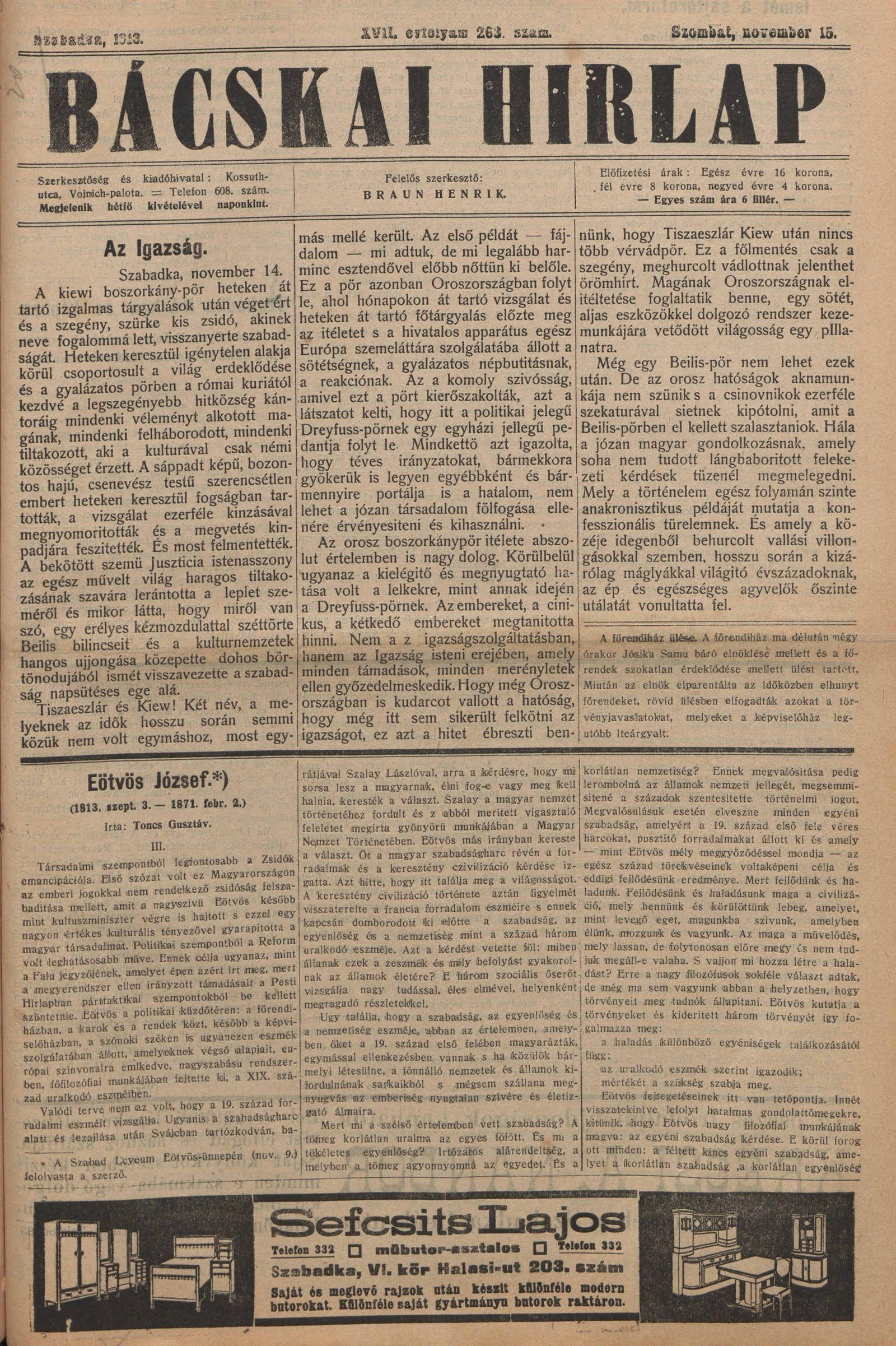 Bácskai Hirlap, 17. évf. 1913. november 15. 263. sz.