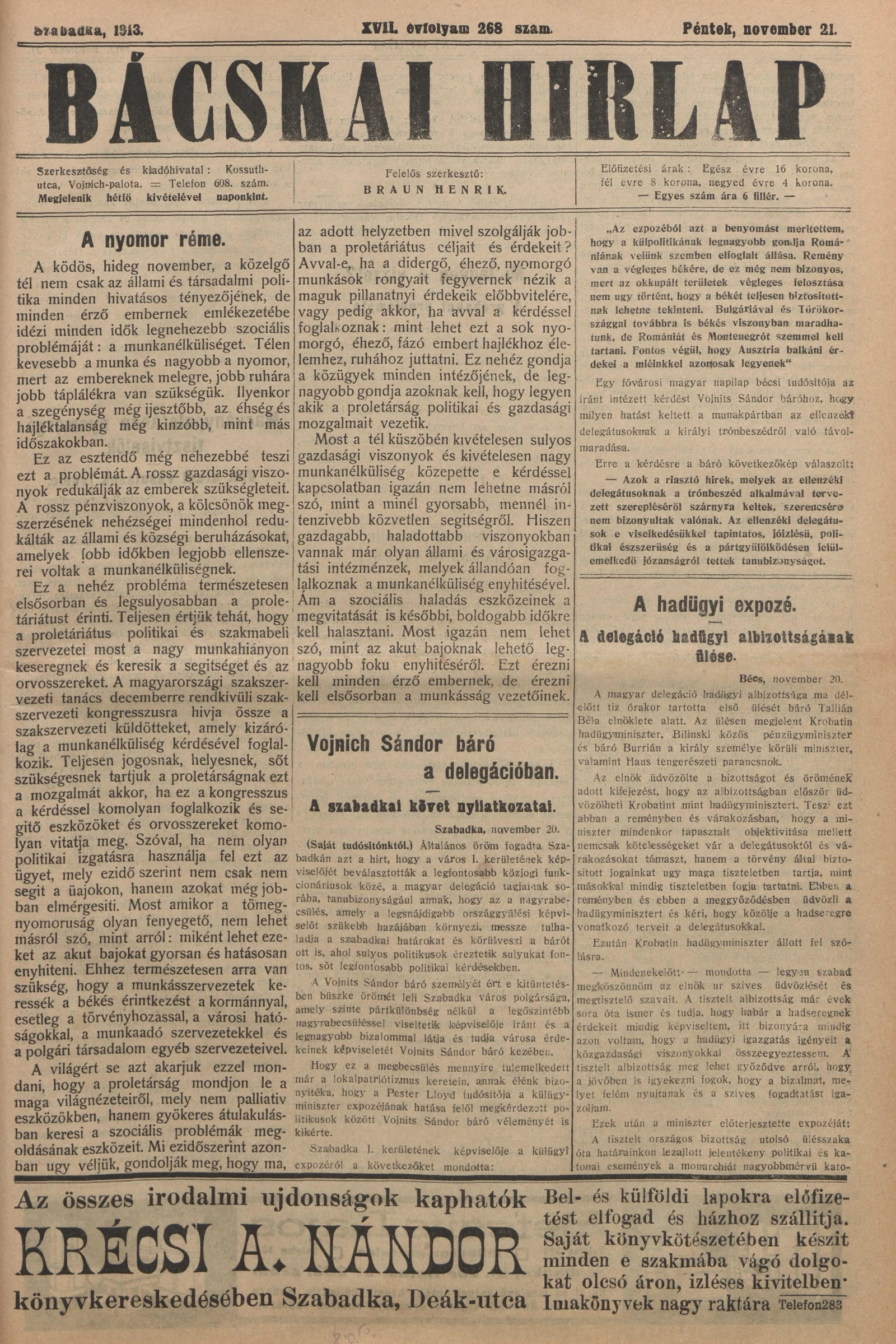 Bácskai Hirlap, 17. évf. 1913. november 21. 268. sz.