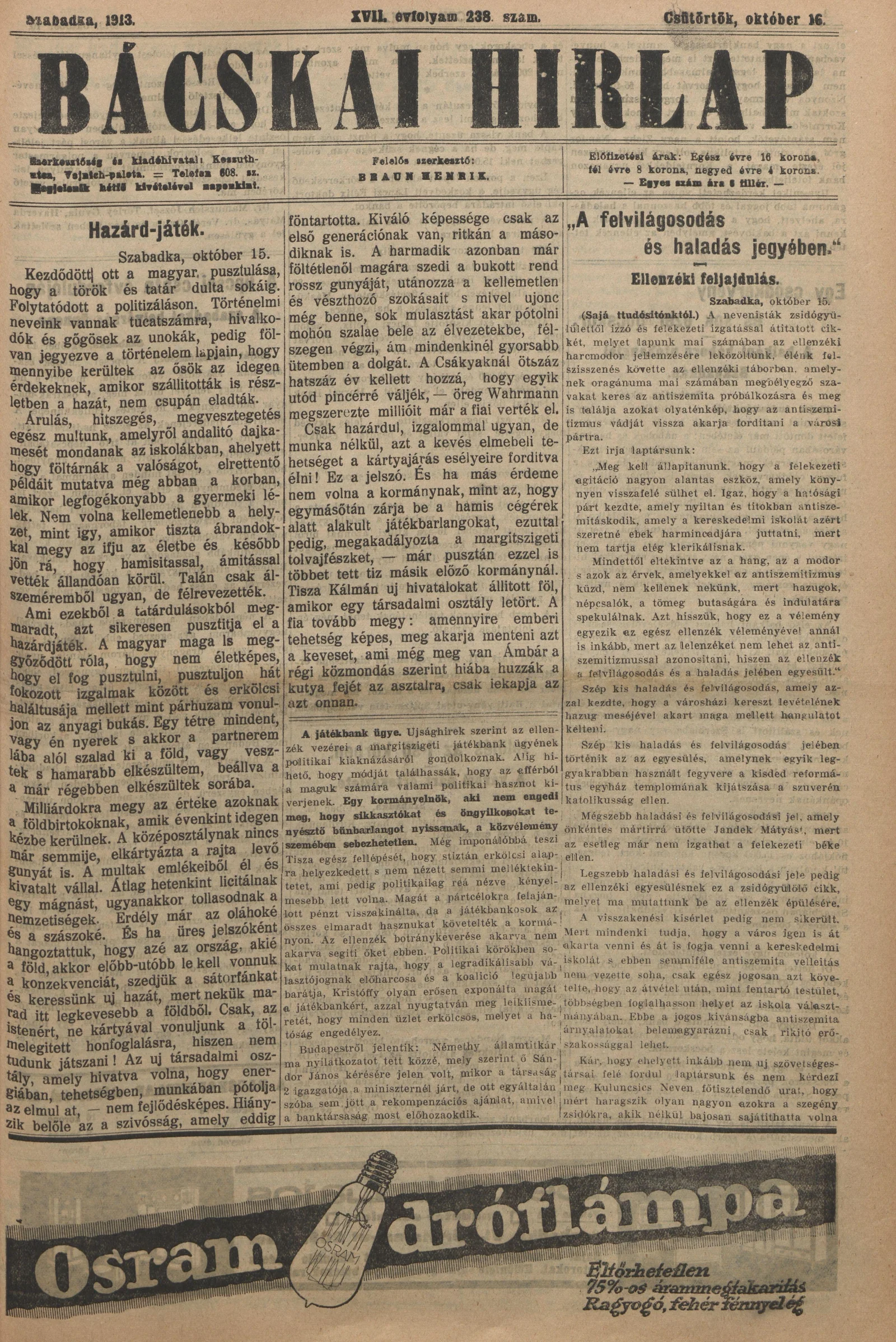 Bácskai Hirlap, 17. évf. 1913. október 16. 238. sz.