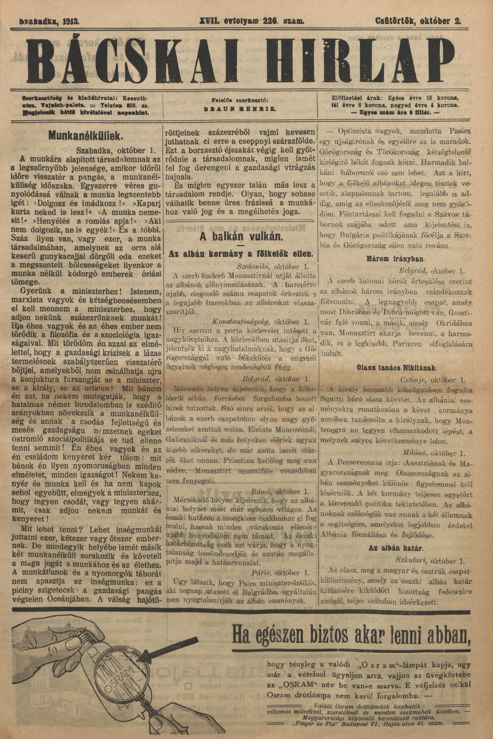 Bácskai Hirlap, 17. évf. 1913. október 2. 226. sz.