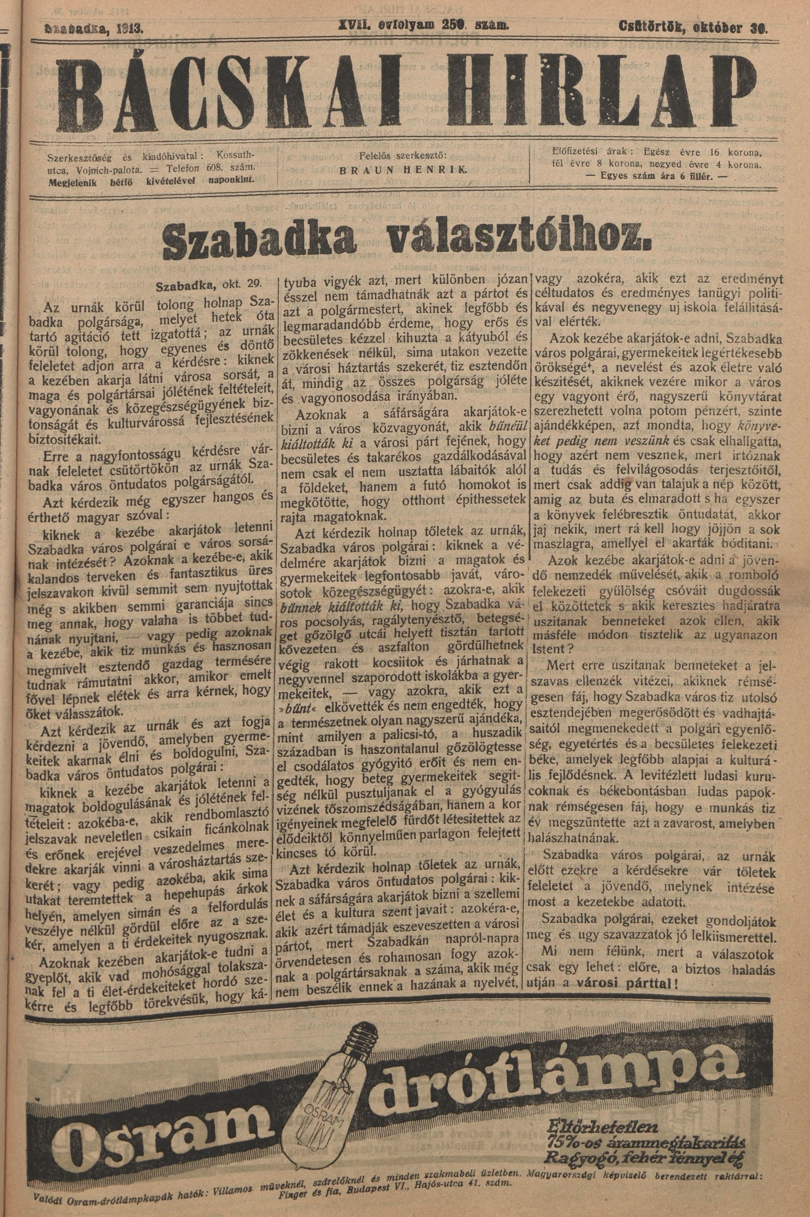 Bácskai Hirlap, 17. évf. 1913. október 30. 250. sz.