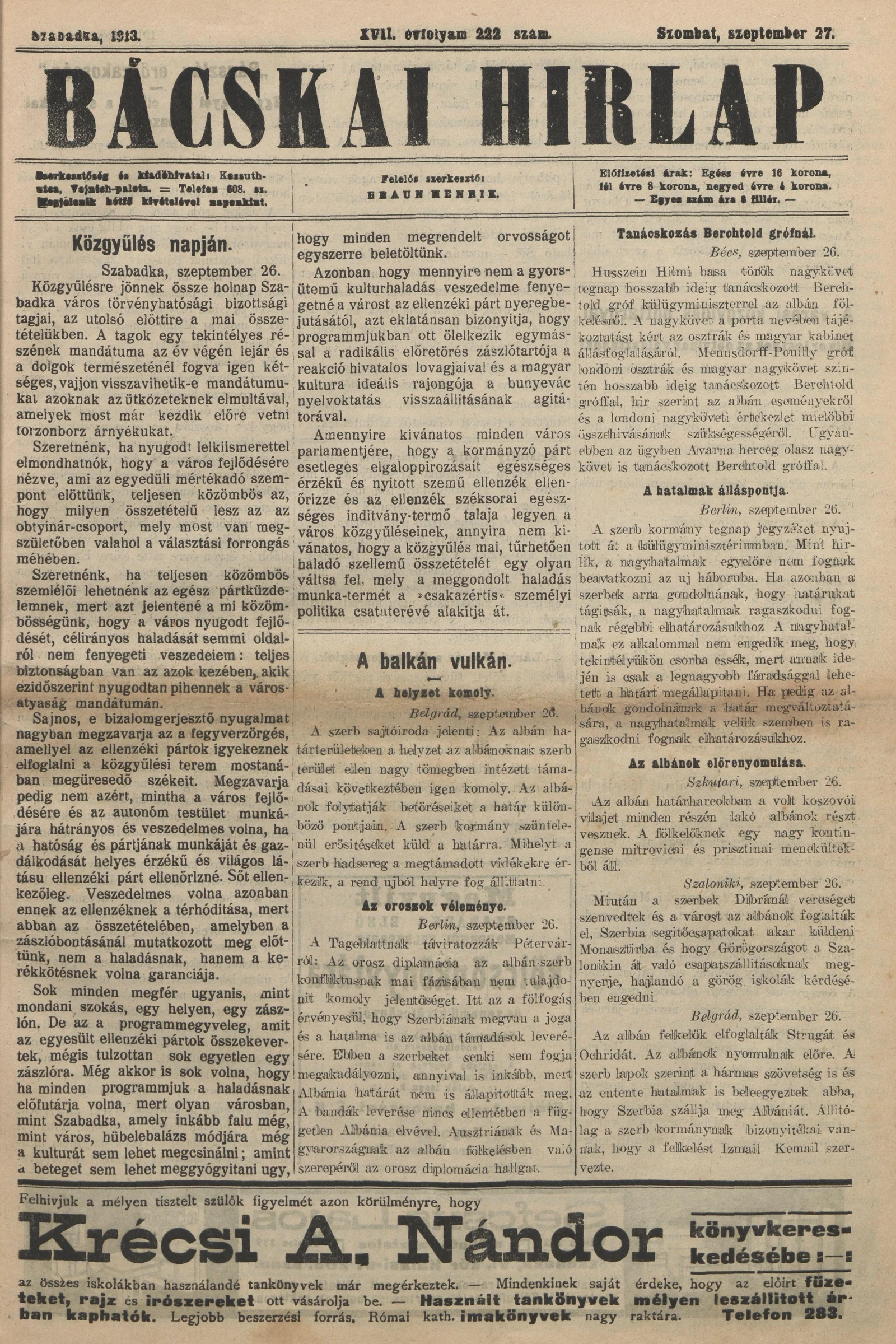 Bácskai Hirlap, 17. évf. 1913. szeptember 27. 222. sz.