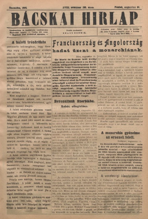 Bácskai Hirlap, 18. évf. 1914. augusztus 14. 184. sz.
