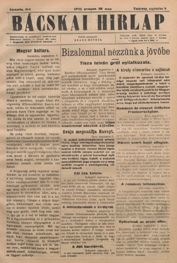 Bácskai Hirlap, 18. évf. 1914. augusztus 9. 180. sz.