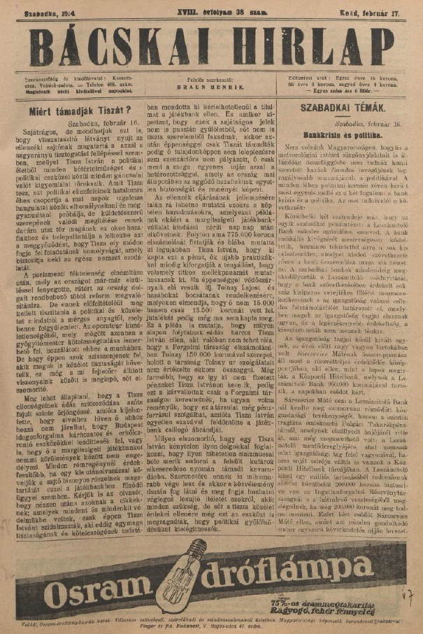 Bácskai Hirlap, 18. évf. 1914. február 17. 38. sz.