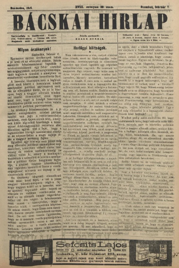 Bácskai Hirlap, 18. évf. 1914. február 7. 30. sz.