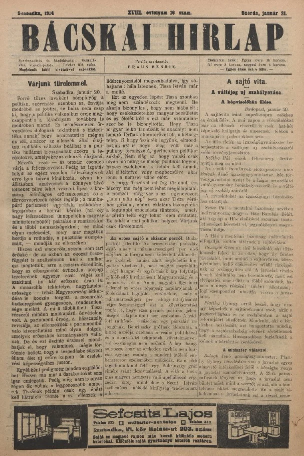 Bácskai Hirlap, 18. évf. 1914. január 21. 16. sz.