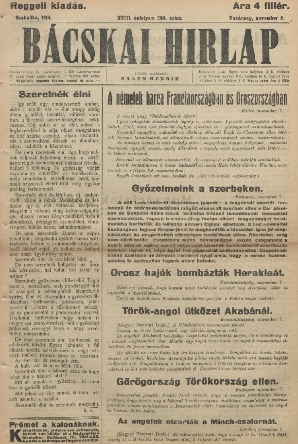 Bácskai Hirlap, 18. évf. 1914. november 8. 288. sz.