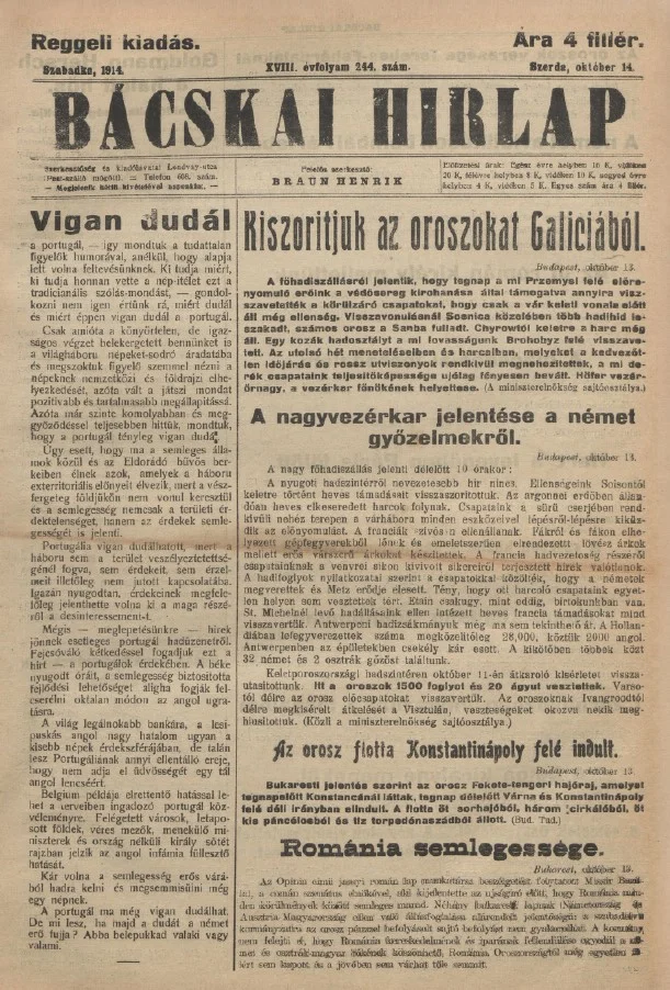 Bácskai Hirlap, 18. évf. 1914. október 14. 244. sz.