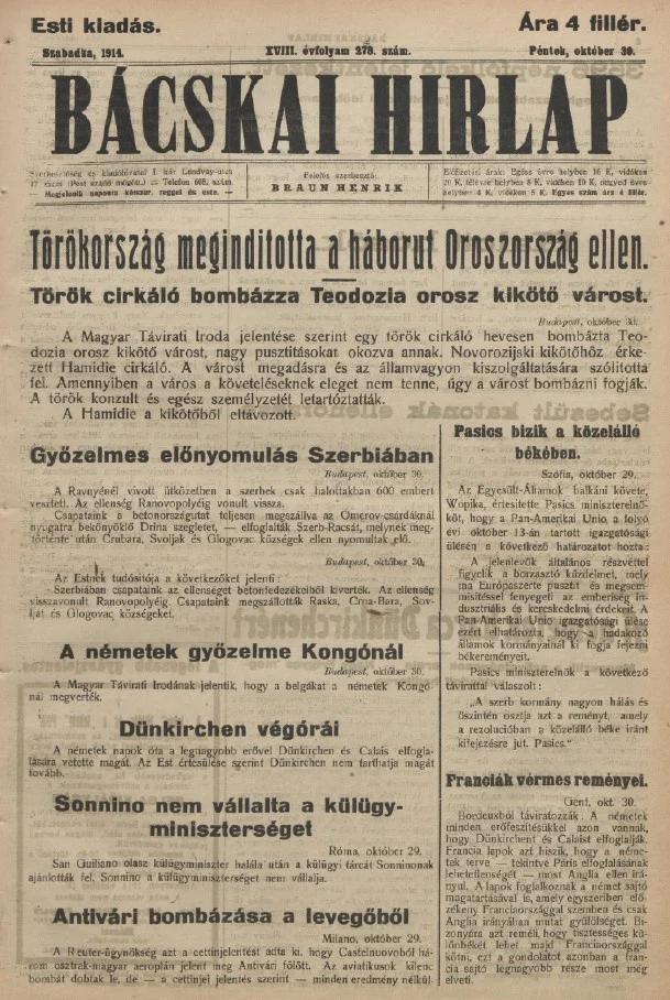 Bácskai Hirlap, 18. évf. 1914. október 30. 273. sz.