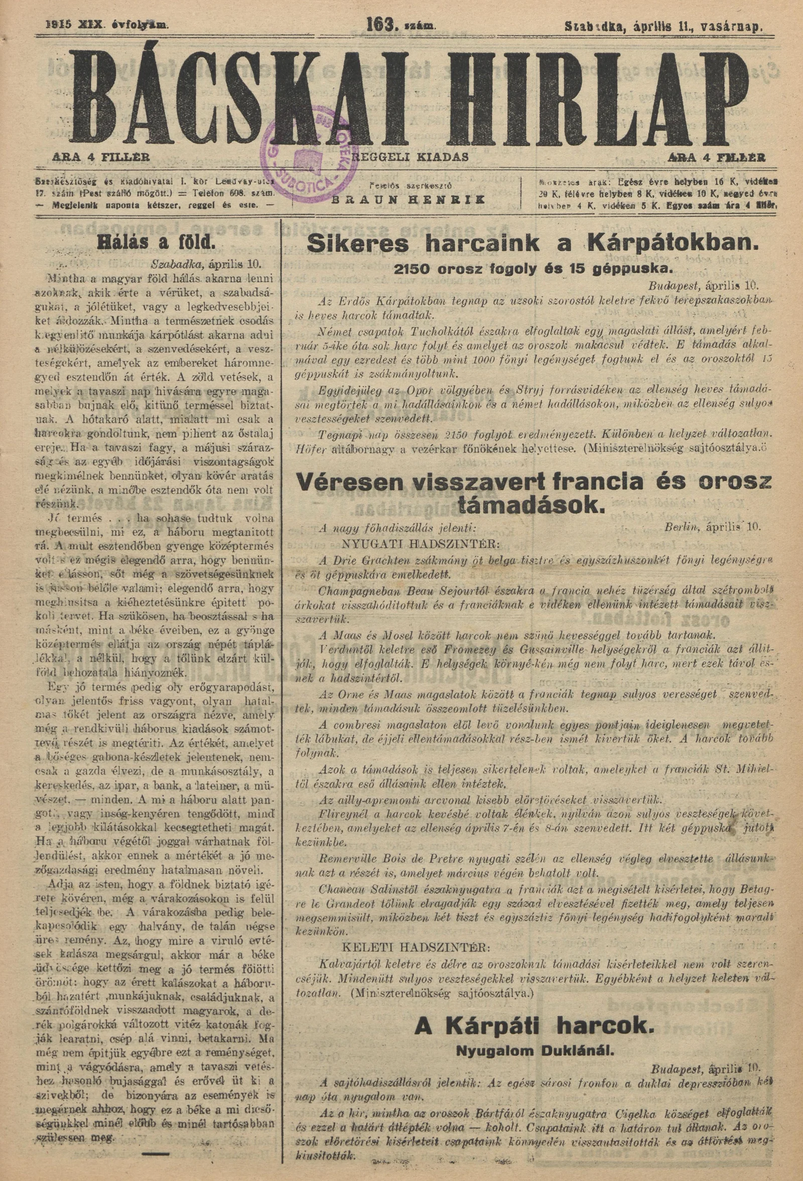 Bácskai Hirlap, 19. évf. 1915. április 11. 163. sz.