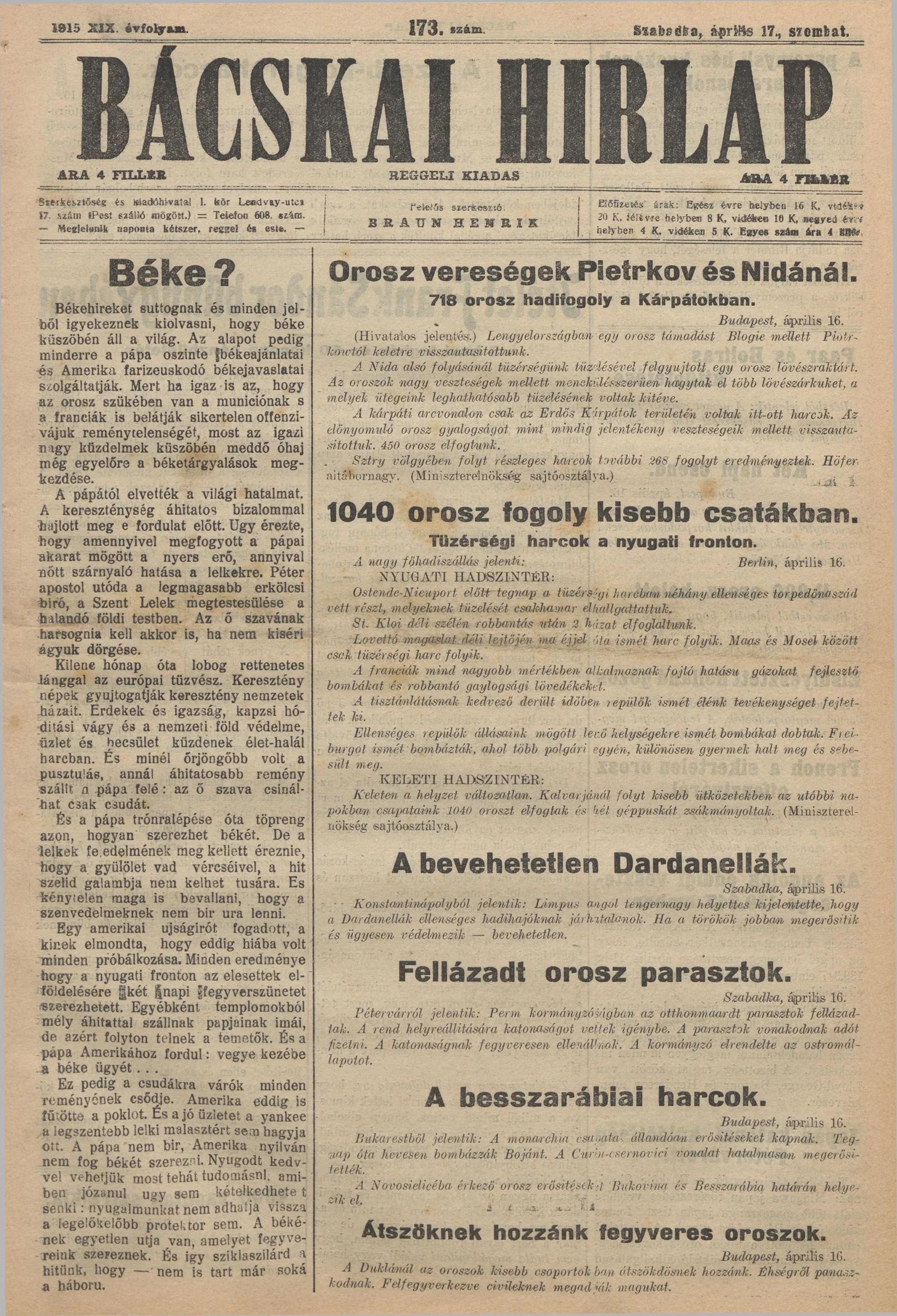 Bácskai Hirlap, 19. évf. 1915. április 17. 173. sz.