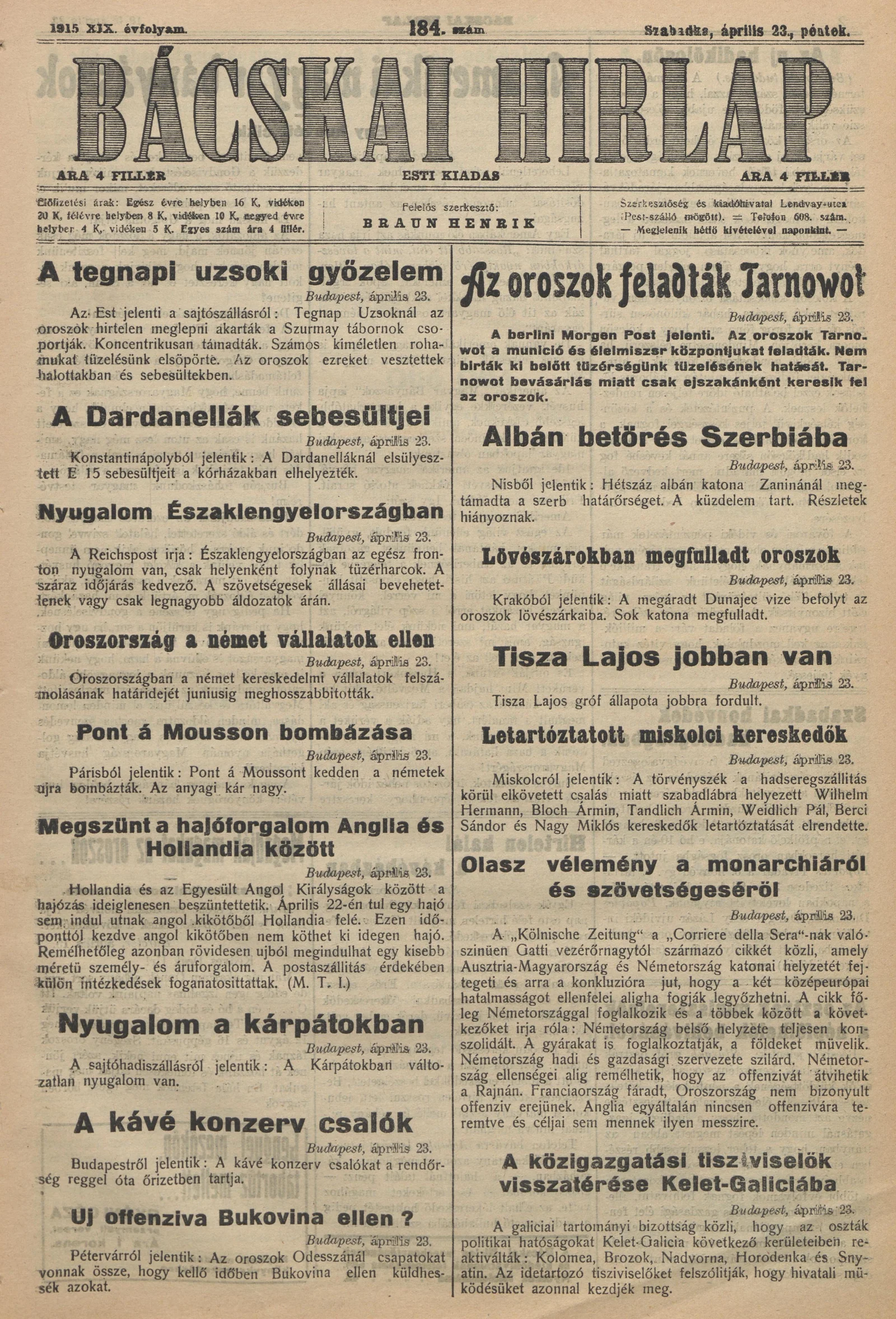 Bácskai Hirlap, 19. évf. 1915. április 23. 184. sz.