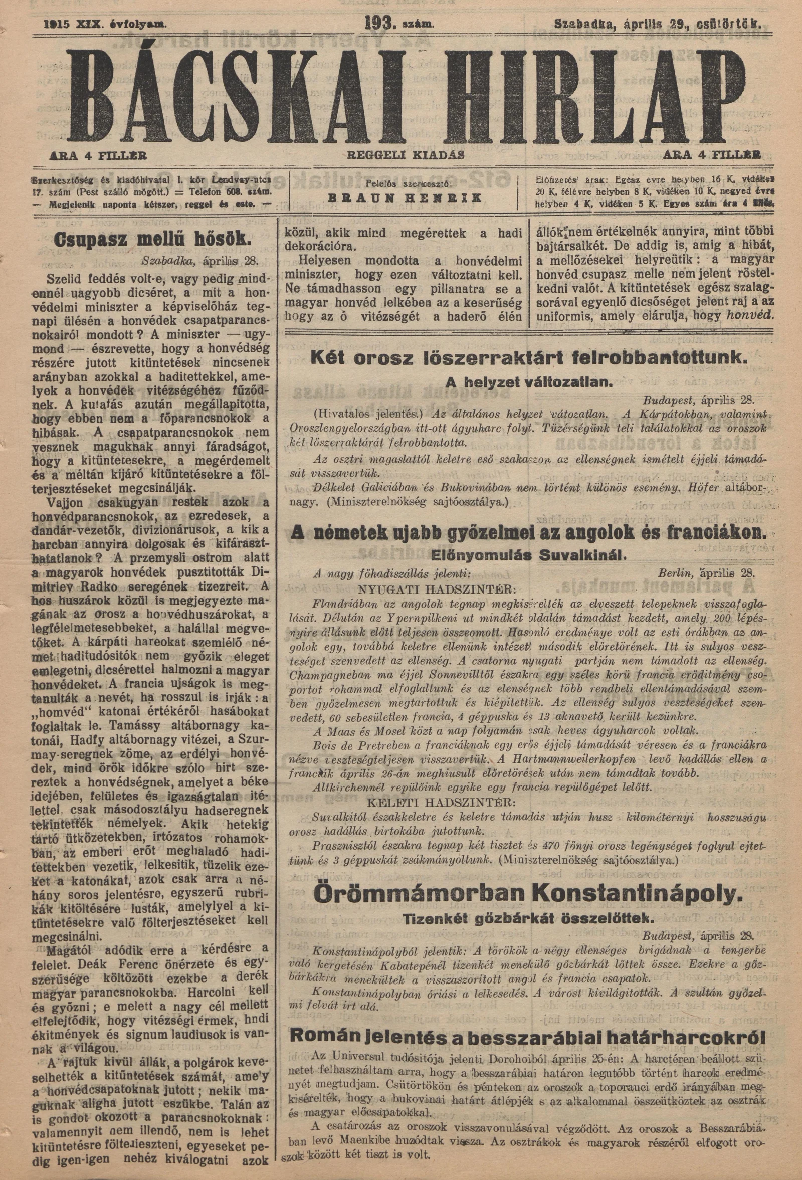 Bácskai Hirlap, 19. évf. 1915. április 29. 193. sz.