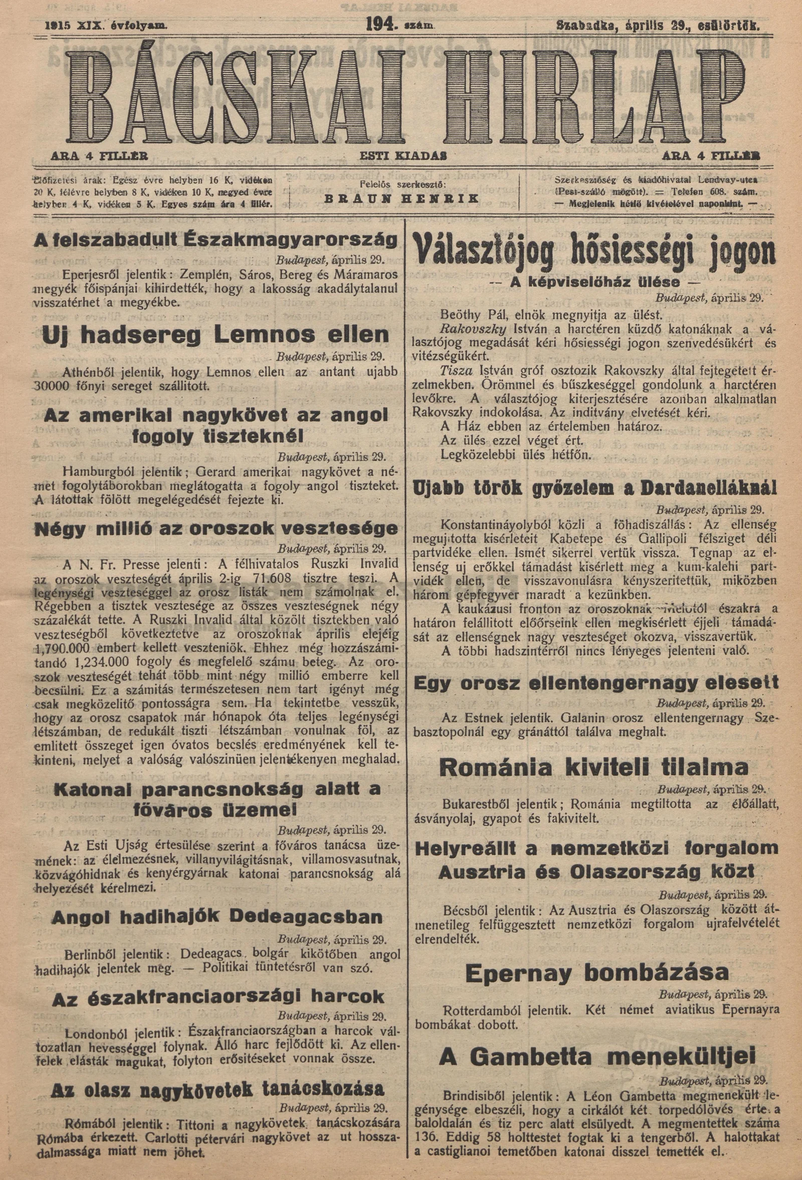 Bácskai Hirlap, 19. évf. 1915. április 29. 194. sz.