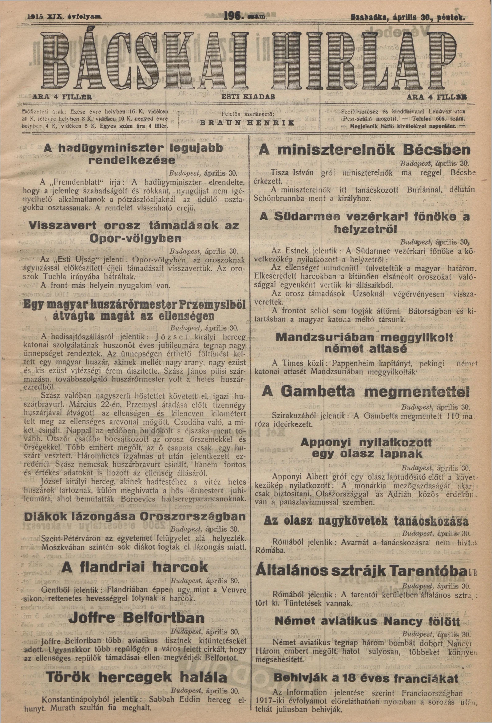 Bácskai Hirlap, 19. évf. 1915. április 30. 196. sz.