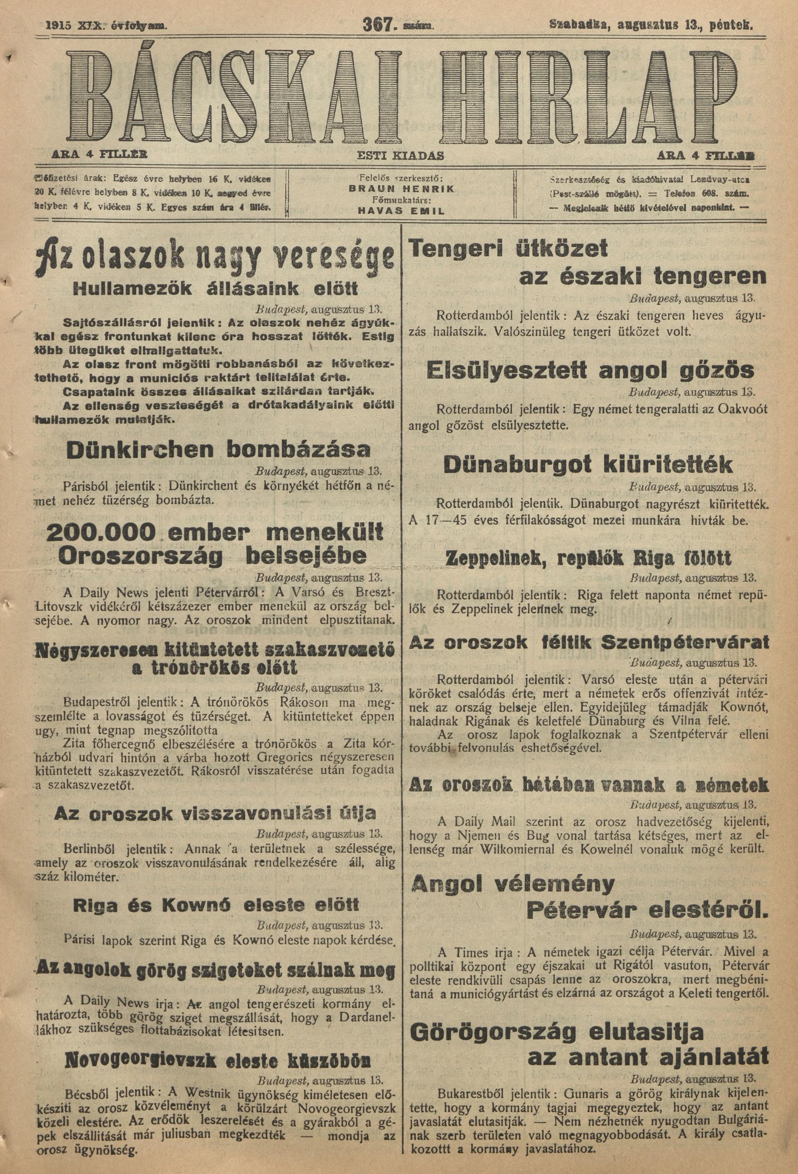Bácskai Hirlap, 19. évf. 1915. augusztus 13. 367. sz.
