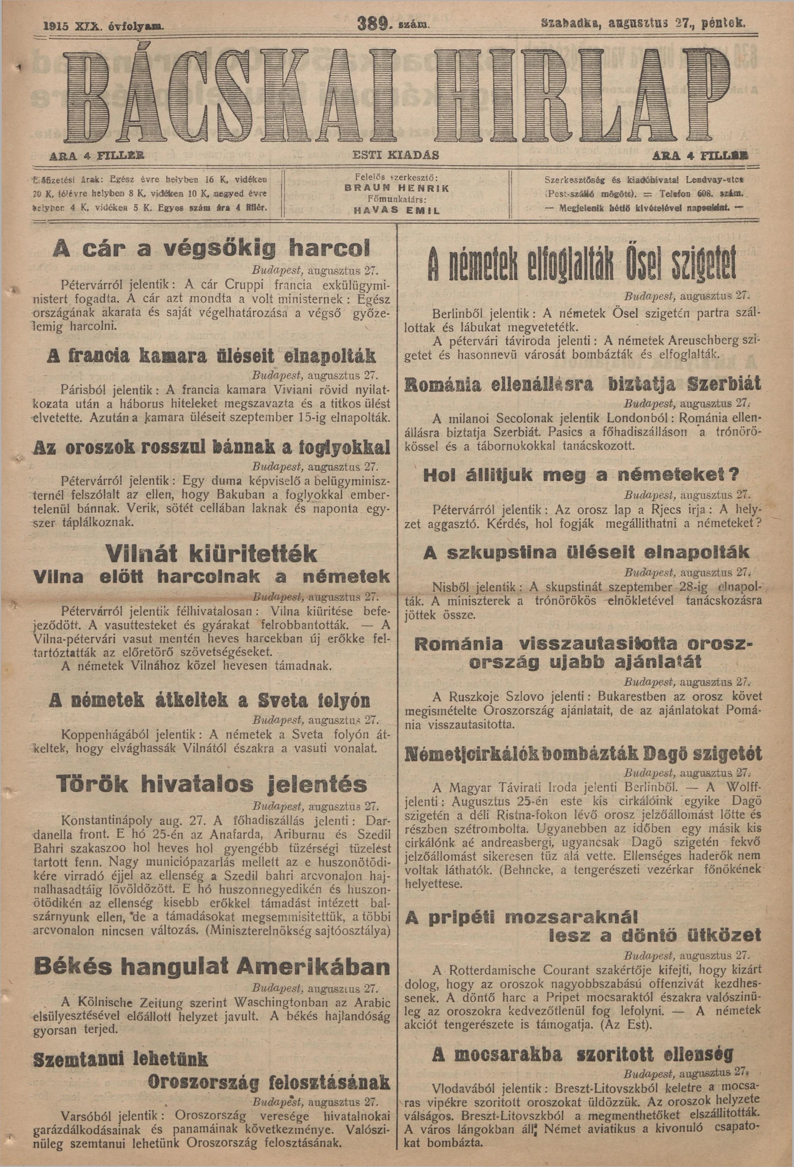 Bácskai Hirlap, 19. évf. 1915. augusztus 27. 389. sz.