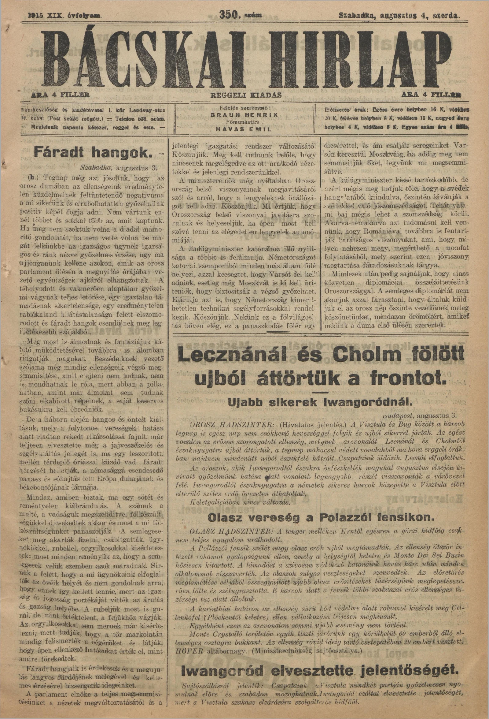 Bácskai Hirlap, 19. évf. 1915. augusztus 4. 350. sz.