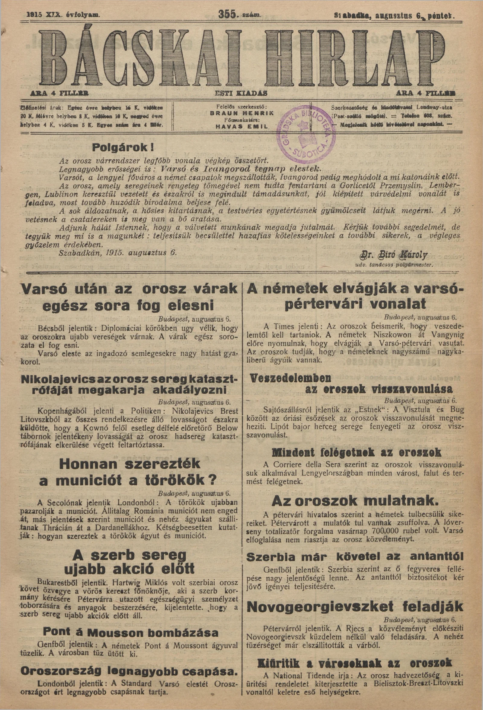 Bácskai Hirlap, 19. évf. 1915. augusztus 6. 355. sz.