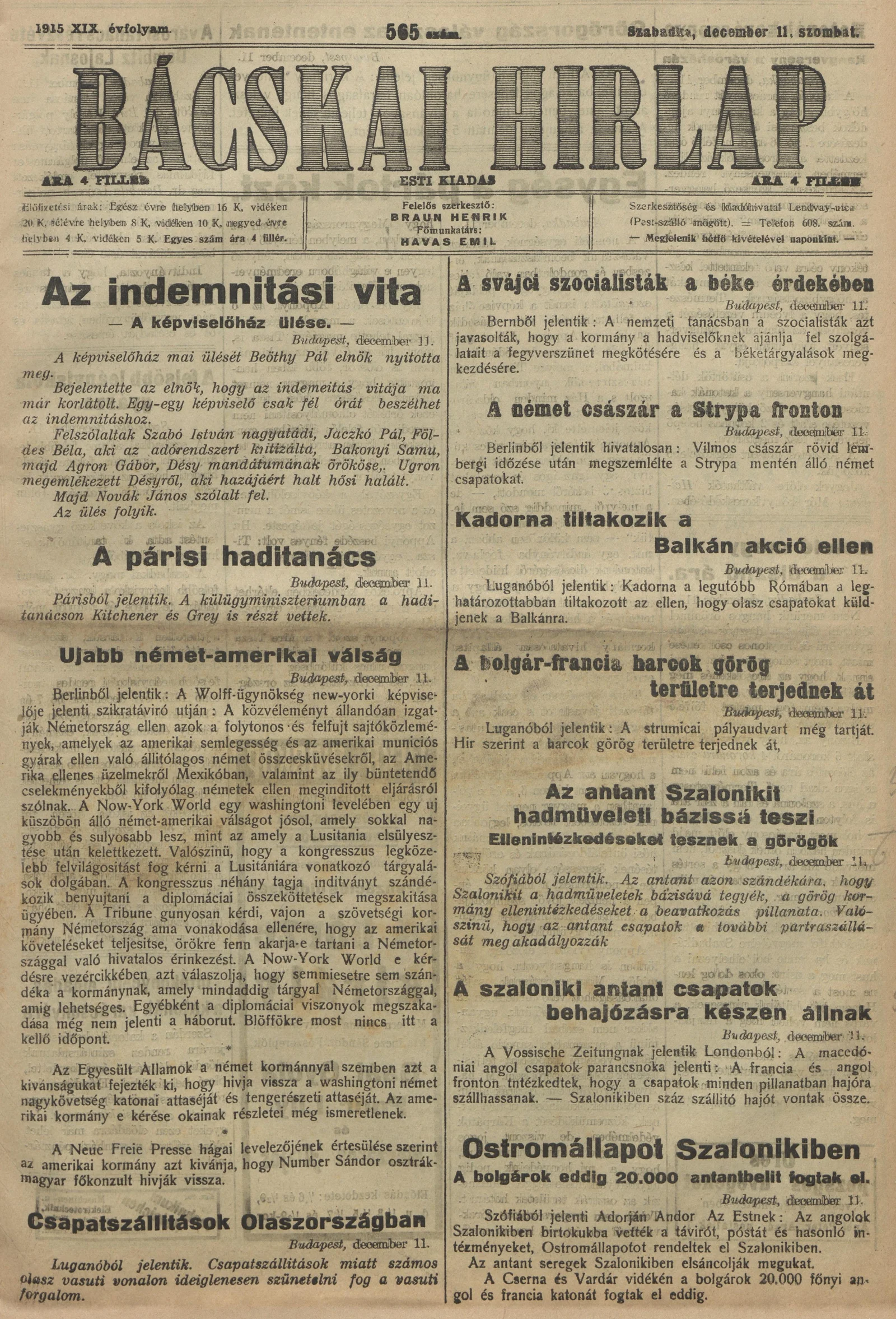Bácskai Hirlap, 19. évf. 1915. december 11. 565. sz.
