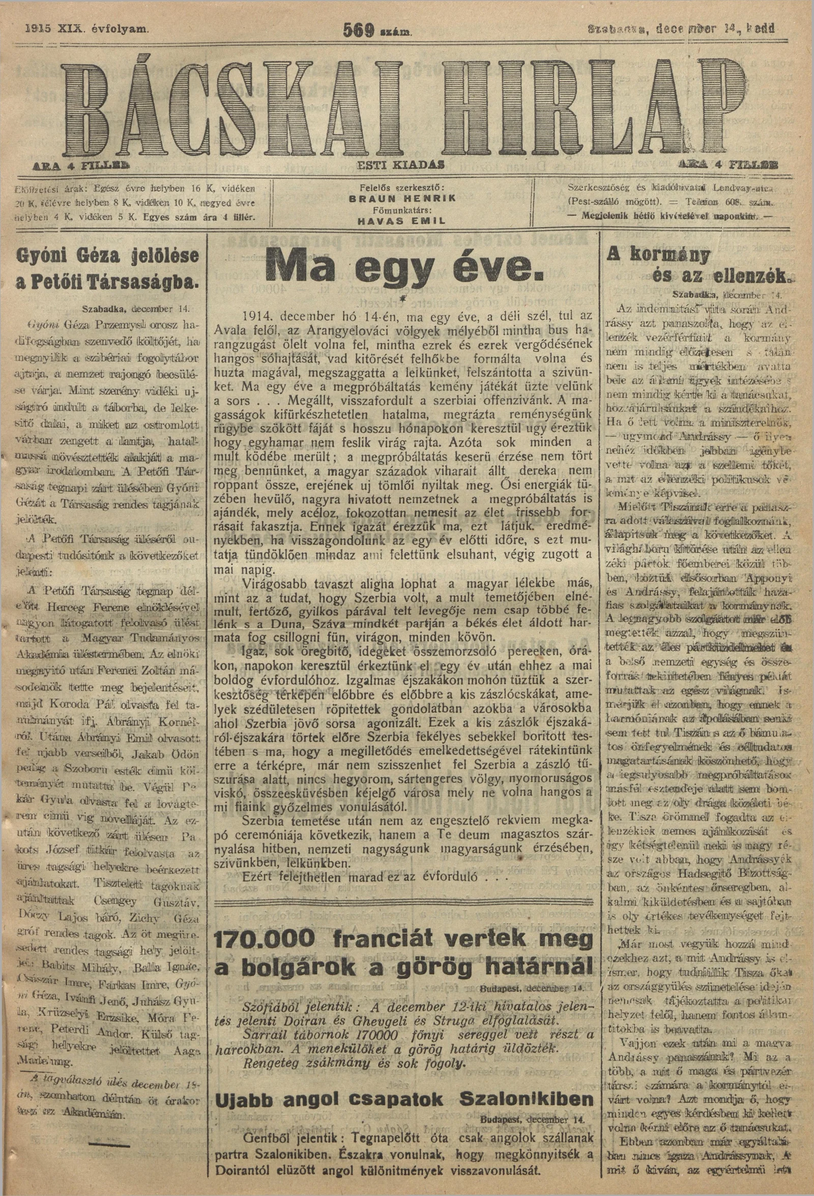 Bácskai Hirlap, 19. évf. 1915. december 14. 569. sz.