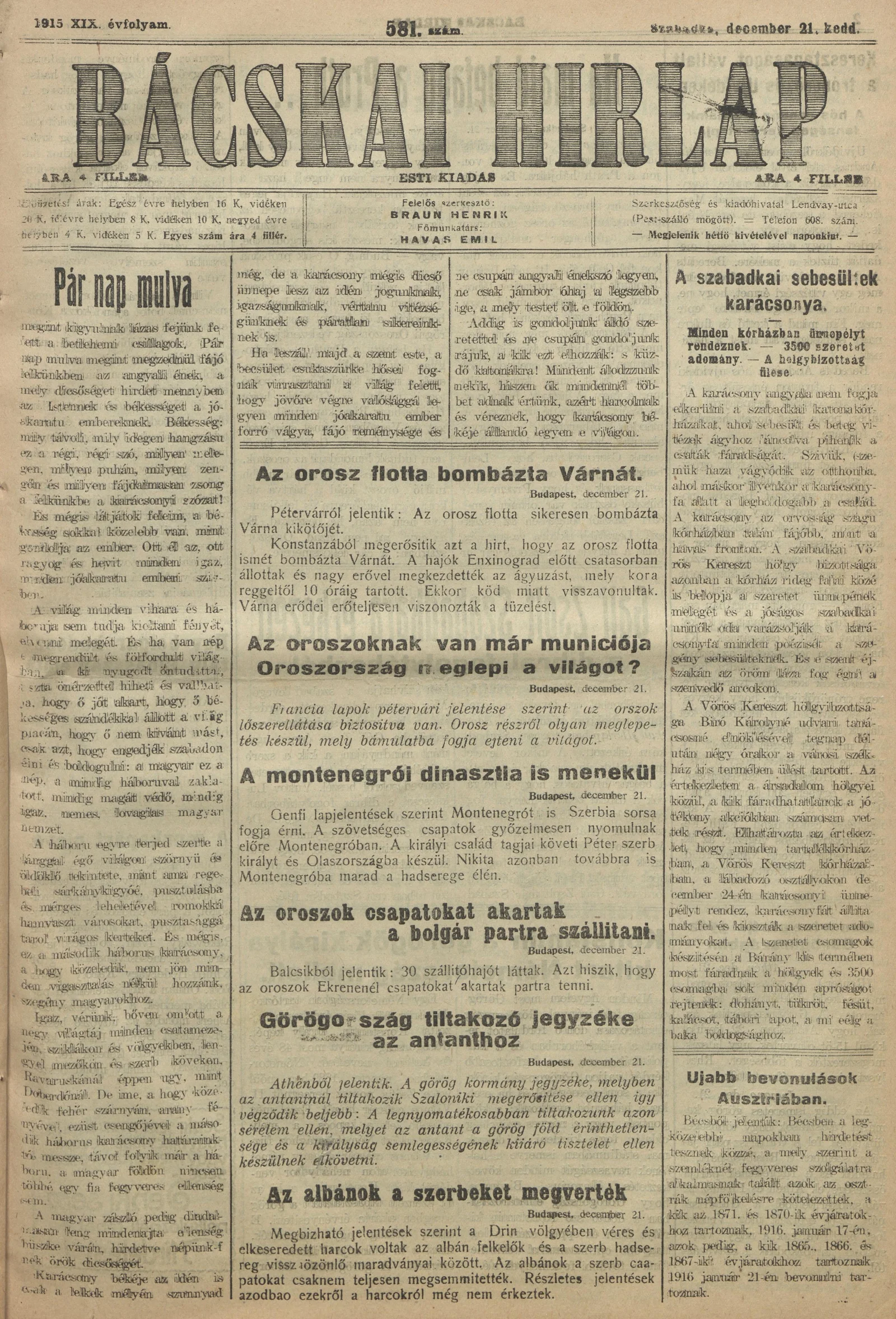 Bácskai Hirlap, 19. évf. 1915. december 21. 581. sz.