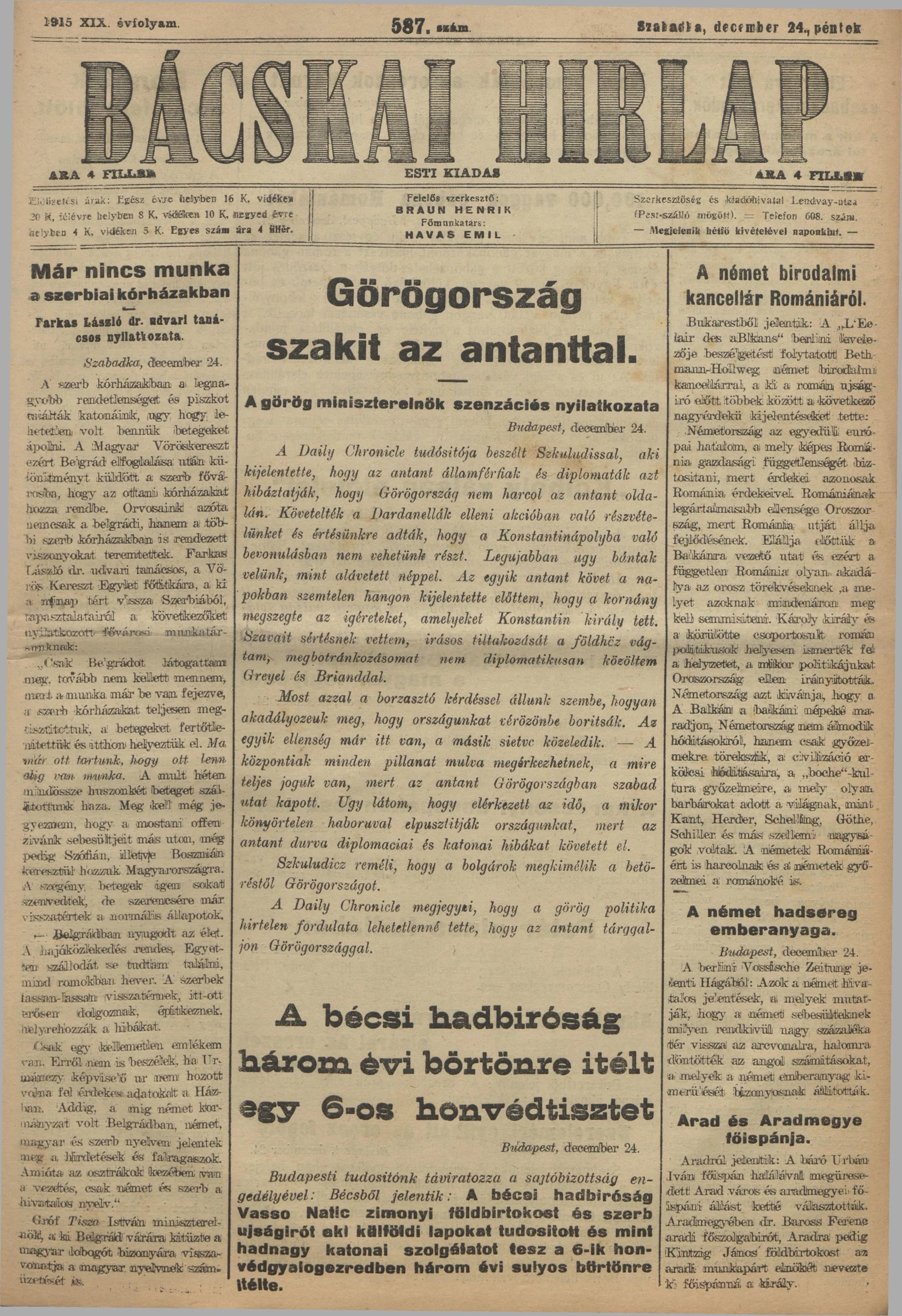 Bácskai Hirlap, 19. évf. 1915. december 24. 587. sz.