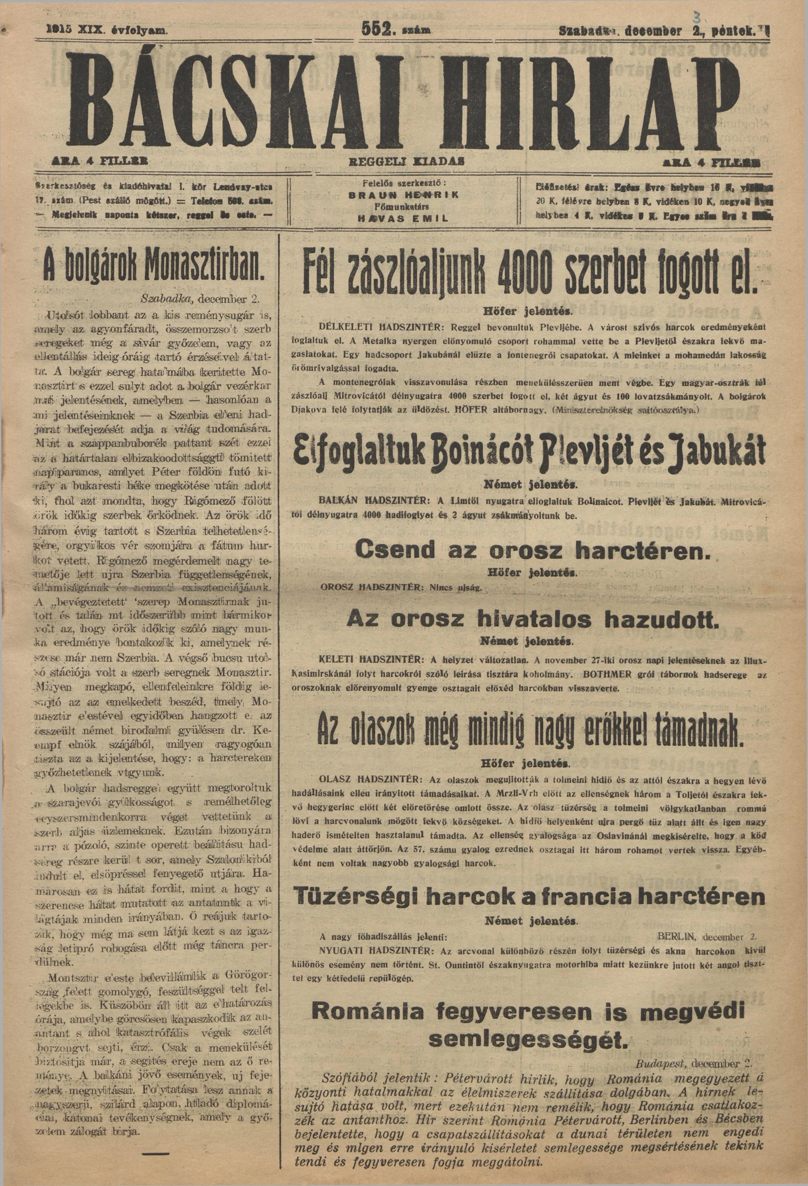 Bácskai Hirlap, 19. évf. 1915. december 3. 552. sz.