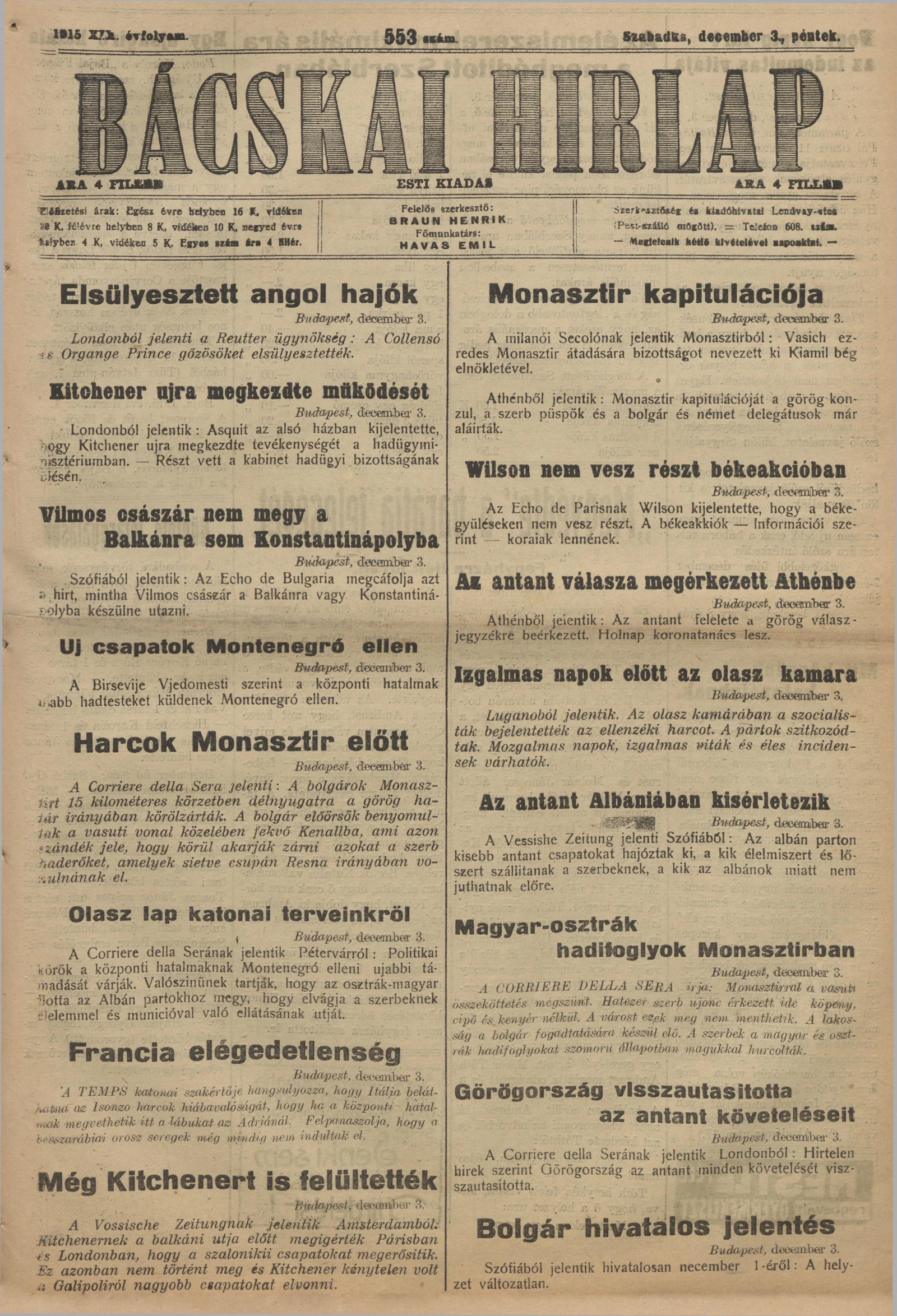 Bácskai Hirlap, 19. évf. 1915. december 3. 553. sz.