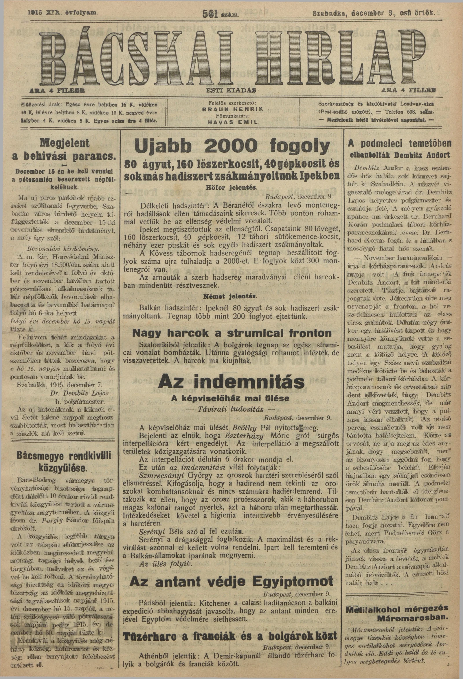 Bácskai Hirlap, 19. évf. 1915. december 9. 561. sz.