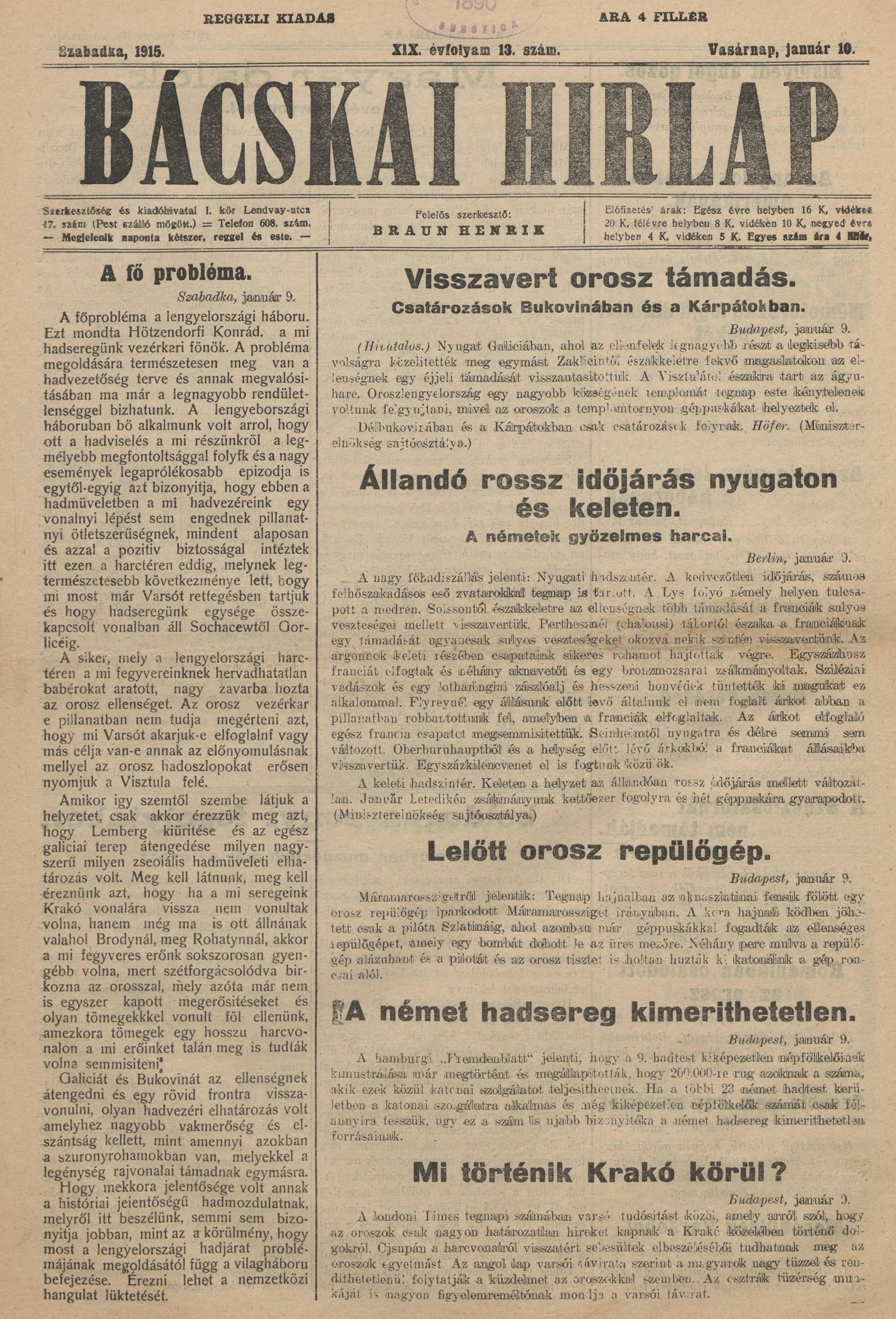 Bácskai Hirlap, 19. évf. 1915. január 10. 13. sz.