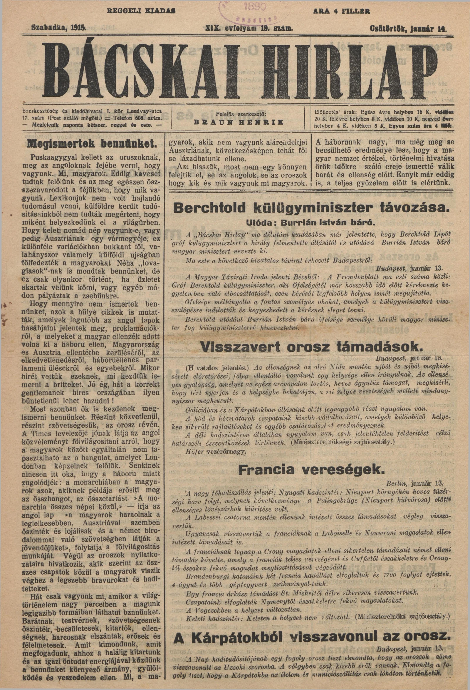 Bácskai Hirlap, 19. évf. 1915. január 14. 19. sz.