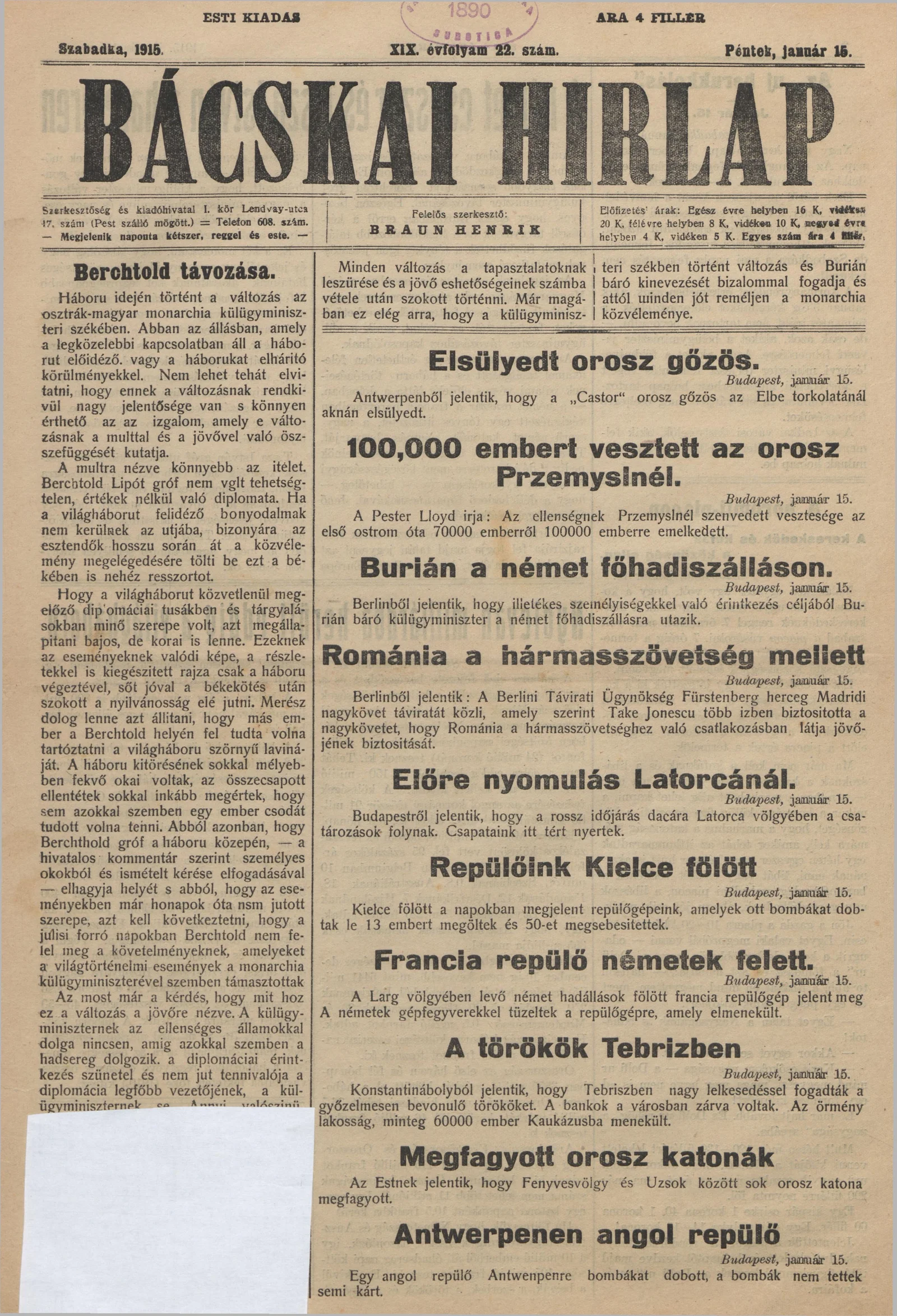 Bácskai Hirlap, 19. évf. 1915. január 15. 22. sz.