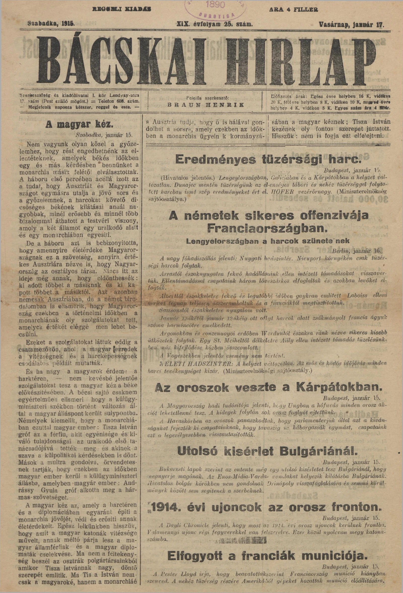 Bácskai Hirlap, 19. évf. 1915. január 17. 25. sz.