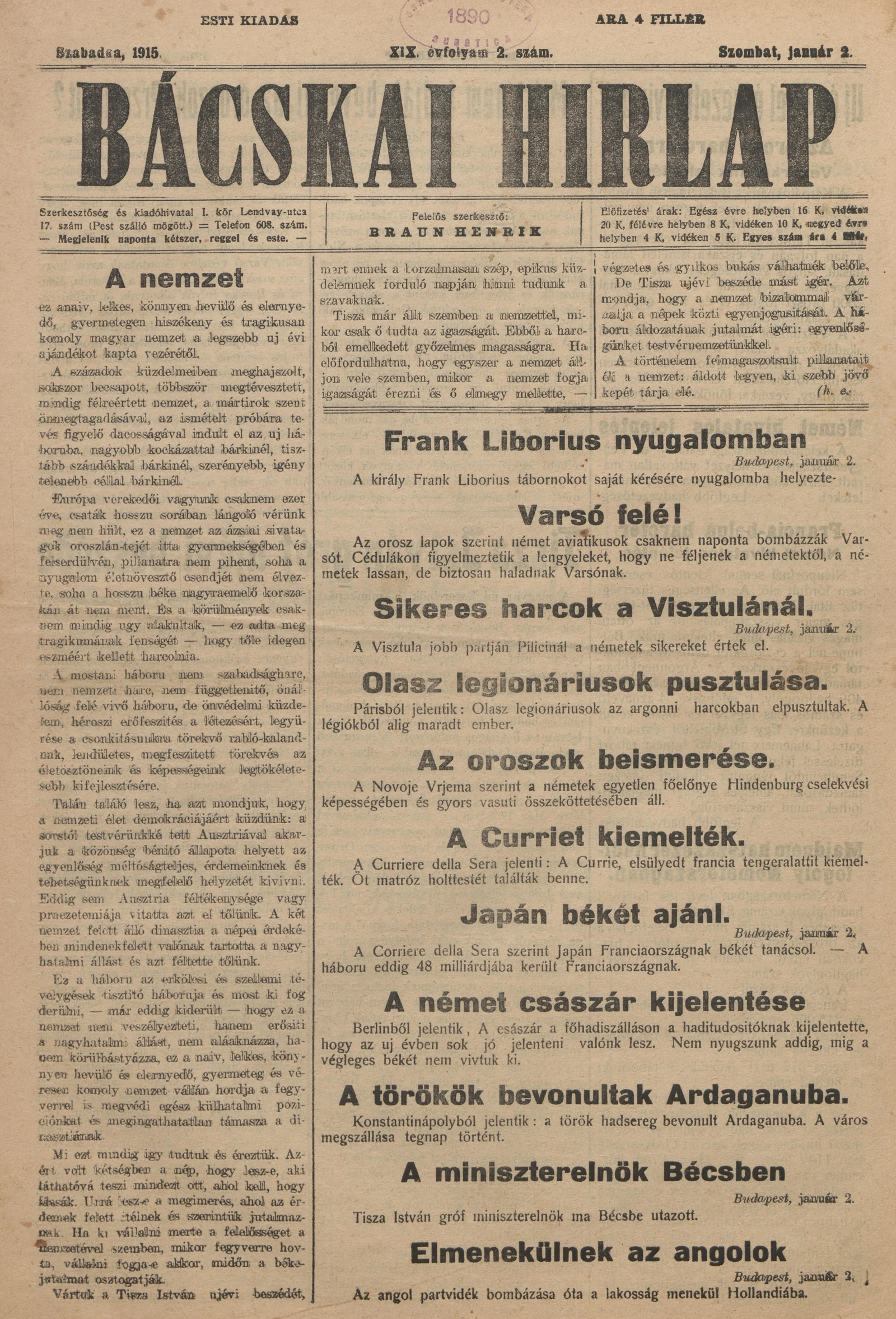 Bácskai Hirlap, 19. évf. 1915. január 2. 2. sz.