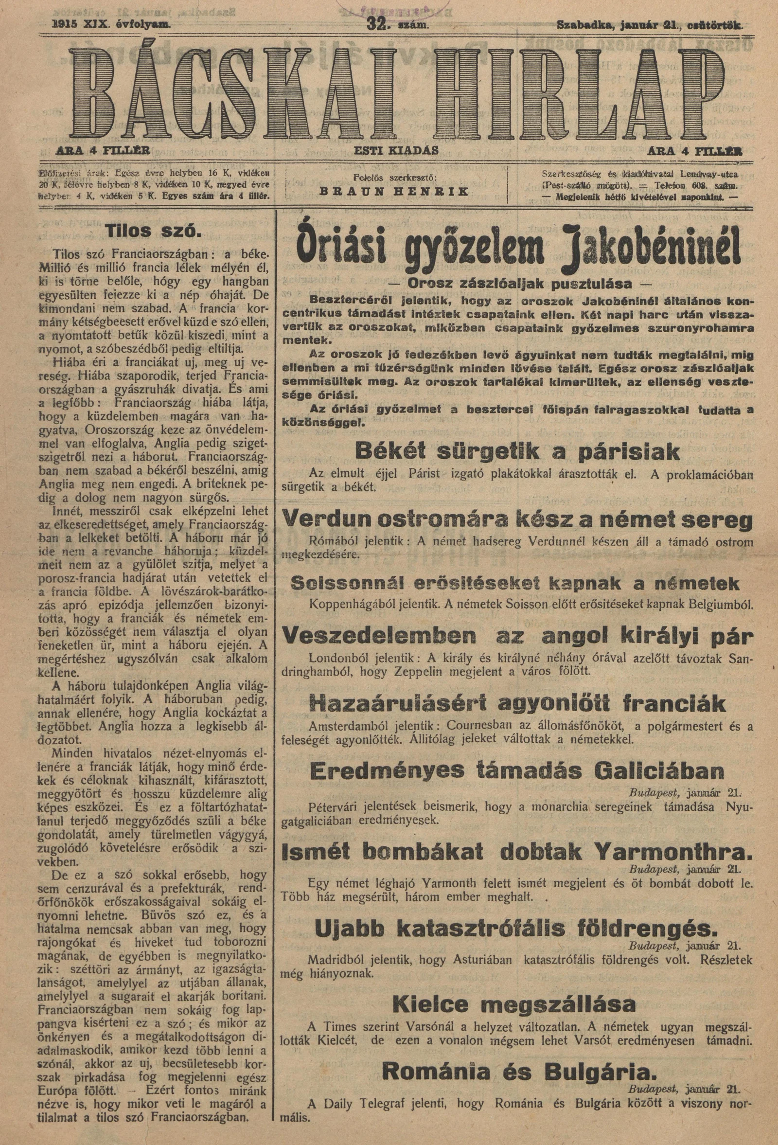 Bácskai Hirlap, 19. évf. 1915. január 21. 32. sz.